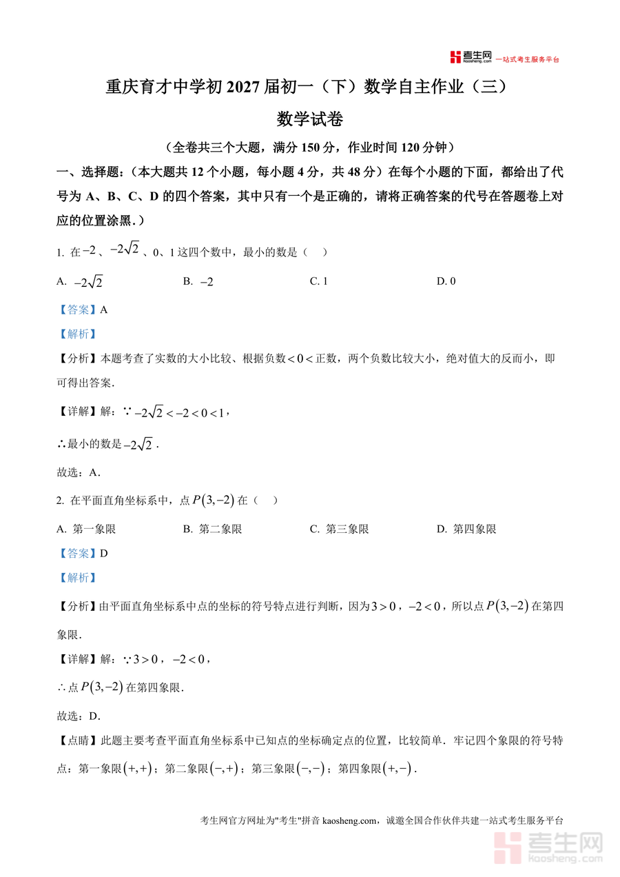 《精品解析:重庆市育才中学校2024-2025学年七年级下学期3月月考数学试题(解析版).docx》是一份针对七年级下学期数学阶段性学习评估的高质量备考资料与真题解析文件。文件包含完整试卷原题及每道题深度解析,试卷结构严格遵循该校月考标准(全卷三大题、满分150分、时长120分钟),涵盖选择、填空、解答三类题型,涉及实数大小比较、平面直角坐标系、二元一次方程组、平行线判定等核心知识点。其特色亮点在于结合重庆育才中学教学特色设计试题,解析部分不仅呈现正确答案,还详细标注考点分析、解题步骤拆解及易错点提示,帮助使用者深入理解知识应用逻辑。