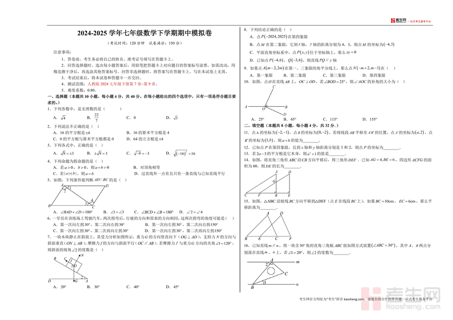 《七年级数学期中模拟卷【测试范围:人教版2024七年级下册第7章-第9章】(考试版A3)(重庆专用).docx》是一份针对重庆地区使用人教版2024七年级下册教材学生设计的期中备考资料。该模拟卷严格覆盖第7章实数、第8章平面直角坐标系、第9章平行线及其判定与性质三大核心模块,试卷结构贴合重庆本地期中统考标准:考试时长120分钟,满分150分,包含选择题(10小题40分)、填空题(8小题32分)、解答题(8小题78分)三类题型,覆盖无理数识别、平方根运算、平行线判定应用、坐标系中点的平移规律等关键知识点。其特色亮点在于重庆专用题型适配性与0.80的难度系数设置——既兼顾基础巩固,又匹配期中考试能力要求,同时附带规范的答题卡使用说明与答题注意事项。
