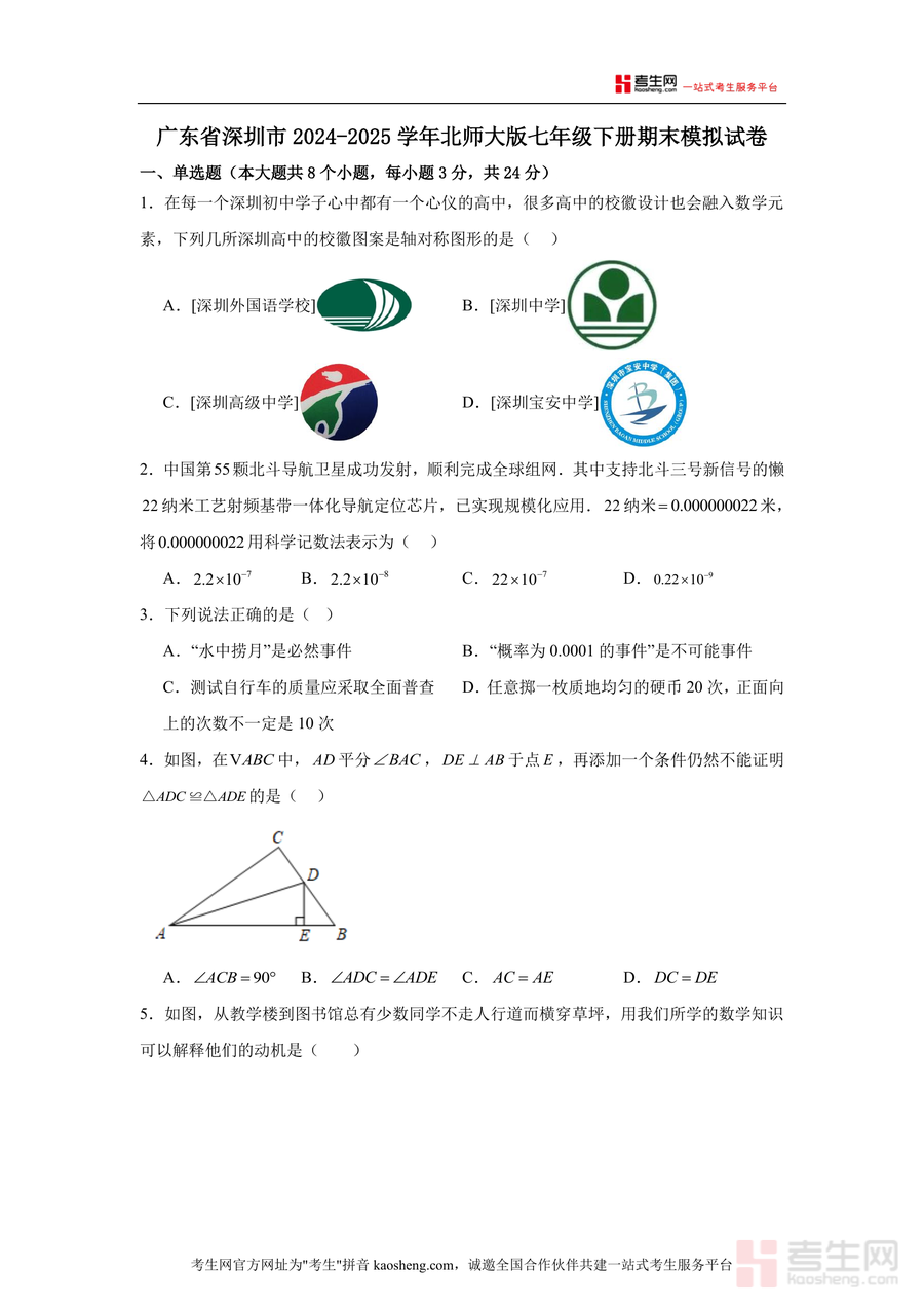 《广东省深圳市北师大版数学七年级下册期末模拟试卷》是一份整合本地教学资源、针对深圳地区七年级学生数学期末备考的数据化资料,包含完整模拟试卷及逐题详细解析。其特色亮点在于结合深圳高中校徽设计轴对称图形题等本地化场景题型,并通过数据化方式呈现考点分布(如代数运算占比约40%、几何图形占比约35%),助力学生快速把握考试重点与命题趋势,同时融入备考资料的核心属性,为学生提供精准复习方向。