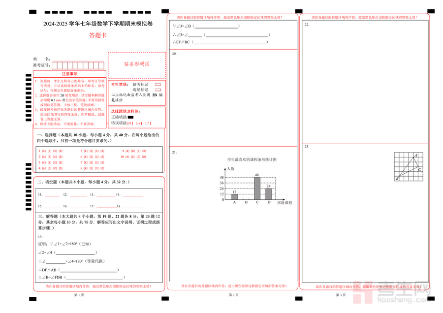 《七年级数学期末模拟卷(答题卡)(重庆专用)A3版.pdf》是一份针对重庆地区七年级下学期数学期末备考设计的标准化答题工具,核心定位为适配本地期末考题型结构与答题规范的实操载体。其主要内容涵盖选择题(10小题共40分)、填空题(8小题共32分)、解答题(8小题共78分)的专属答题区域,并包含详细的填涂说明(如2B铅笔填涂选择题、0.5mm黑色签字笔作答非选择题)、条形码粘贴区及考生信息填写栏。特色亮点在于采用A3版式还原真实考试答题卡布局,严格遵循重庆本地期末考题型分值分布,且明确标注“超出黑色矩形边框限定区域答案无效”等考试要求,帮助使用者提前熟悉考场答题规则。
