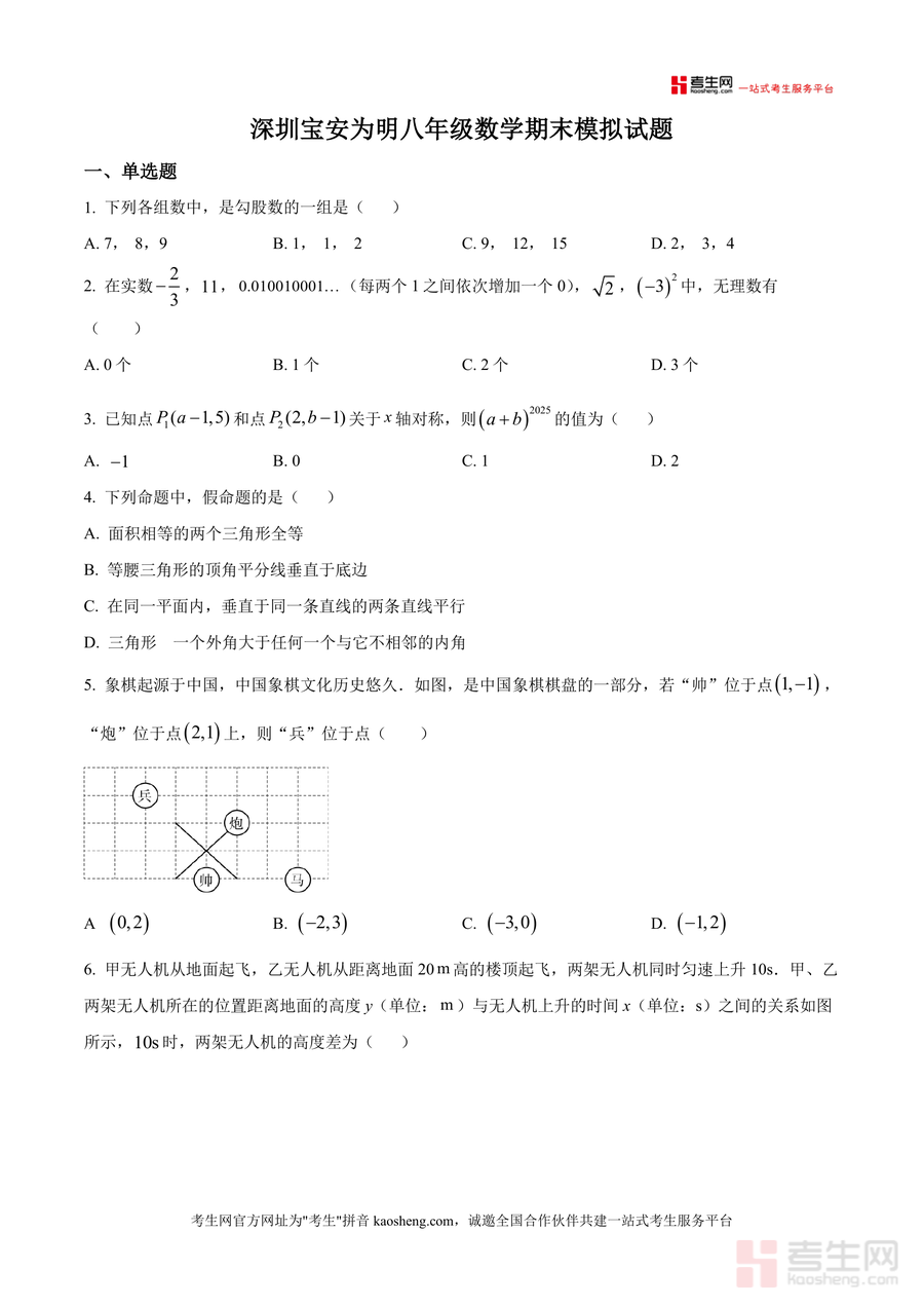 《精品解析:广东省深圳市宝安区为明双语实验学校2025-2026学年上学期八年级上数学1月月考试卷(原卷版).docx》是一份针对深圳宝安为明双语实验学校八年级上学期数学学科的阶段性备考资料。该试卷涵盖勾股定理应用、实数分类判断、轴对称点坐标求解、真假命题辨析、平面直角坐标系与函数图像分析等核心知识点,并包含单选、填空、解答三大题型共20道题目,全面匹配该校教学进度与期末前阶段性考试的命题要求。其特色在于紧密贴合本地校考命题风格,能帮助学生精准把握考点分布与题型设置规律。