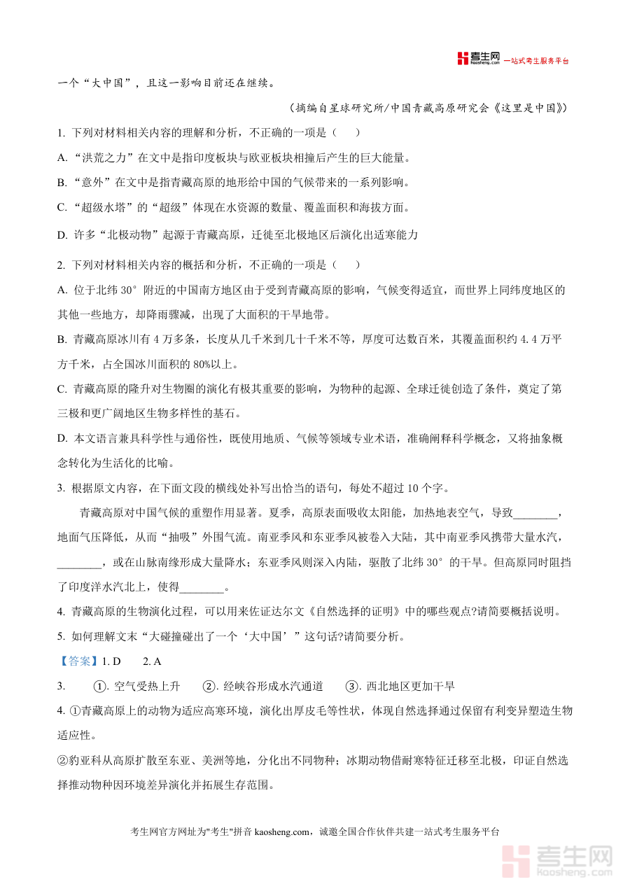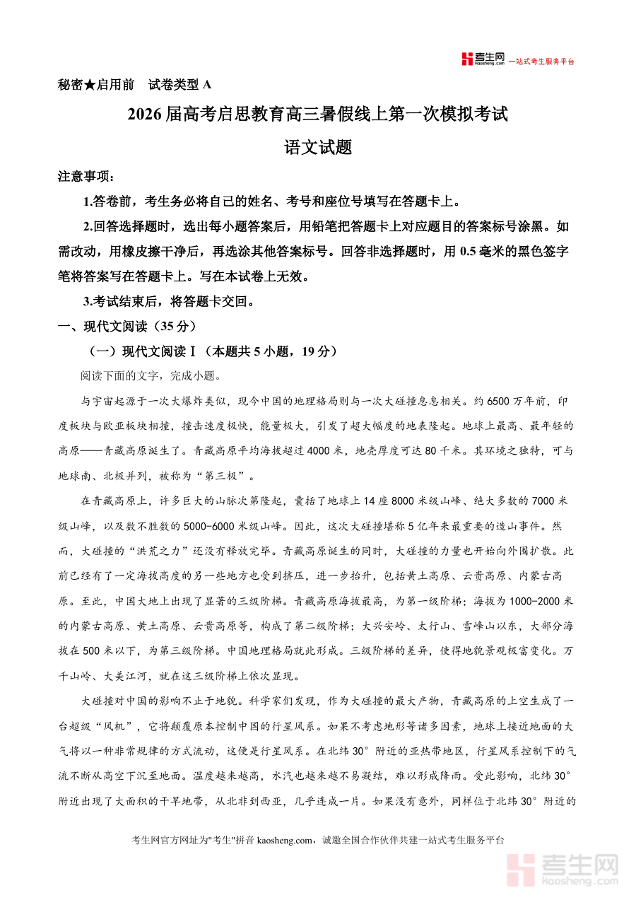 《精品解析:山东省启思大联考2025-2026学年高三上学期开学检测语文试题(解析版).docx》是一份聚焦高三语文开学检测需求且兼具学科深度与实用性的专业备考资料,涵盖现代文阅读等核心题型及完整解析内容。其特色亮点在于结合地质演化、气候学等多学科知识阐释文本逻辑——如对青藏高原形成与中国地理格局关系的深度解读——解析过程兼顾科学性与通俗性:既保留地质、气候领域专业术语的准确性,又通过"超级水塔""洪荒之力"等生活化比喻降低理解门槛,助力学生把握真题解析的核心逻辑与学科关联,强化对考点本质规律的认知?