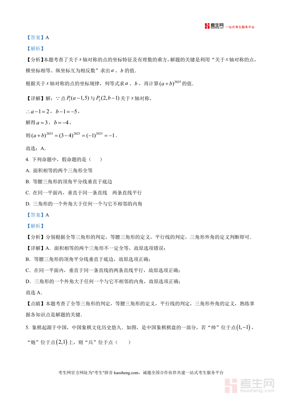 该资料核心用途在于帮助学生完成月考错题深度复盘与核心知识点巩固,适用于日常练习后的针对性查漏、考前1-2周集中复习等场景。通过逐题解析,学生可掌握不同题型对应的解题思路与技巧(如坐标变换中关于x轴对称点的坐标规律),同时了解该校月考命题常见角度与难度设置,显著提升应试能力。相较于普通教辅,其优势在于紧密贴合该校学情,解析内容更具针对性,能有效缩短学生复习路径,提高备考效率。