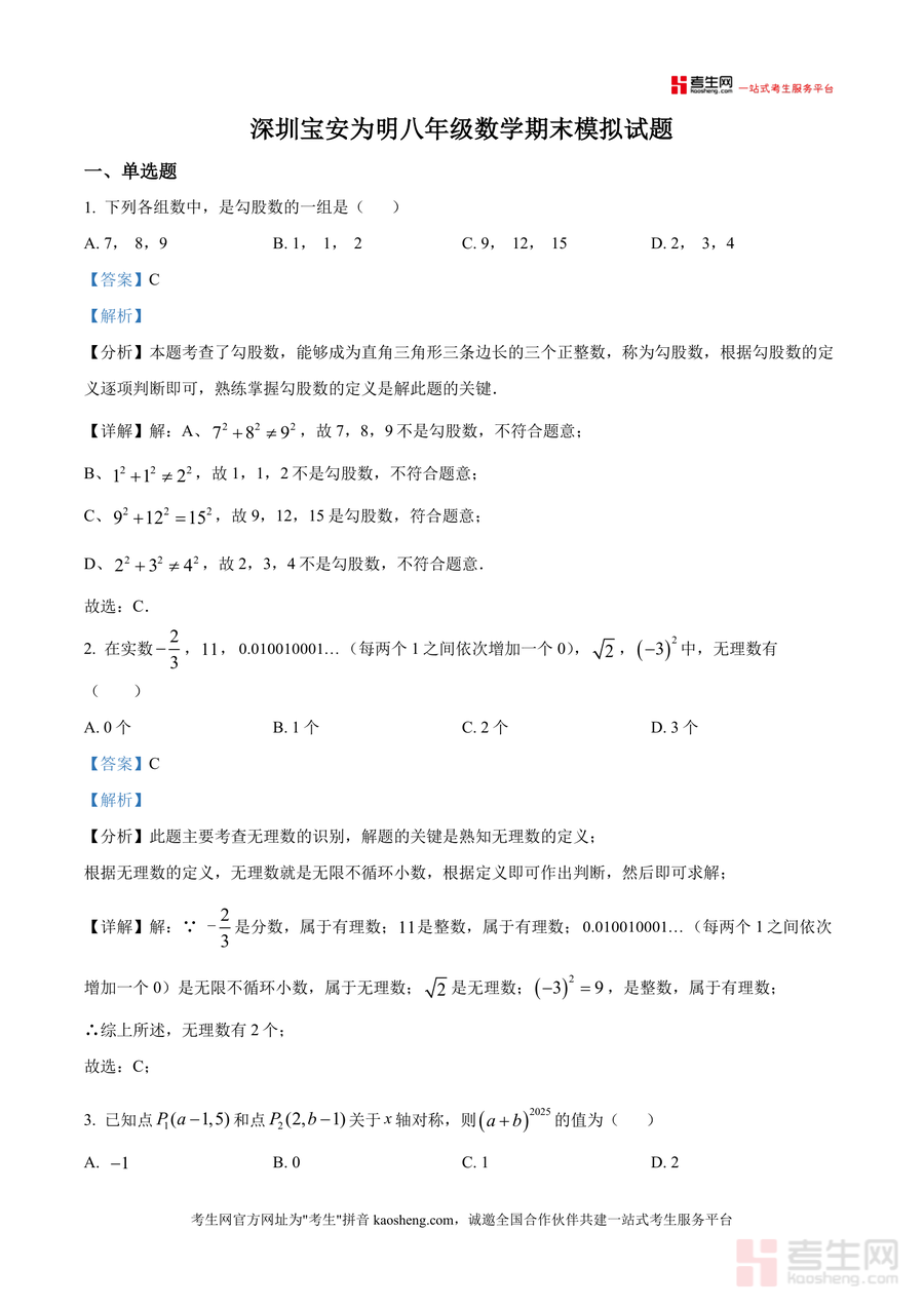 《精品解析:广东省深圳市宝安区为明双语实验学校2025-2026学年上学期八年级上数学1月月考试卷(解析版).docx》是一份精准匹配深圳宝安为明双语实验学校八年级数学教学进度与月考命题方向的数据化备考资料。该资料覆盖单选题、填空题、解答题等全题型结构,包含勾股数判断、无理数识别、坐标对称变换等核心知识点考查题目,并针对每道题提供详尽分析、步骤化详解及易错点提醒——如勾股数题目强调"正整数"与"勾股定理逆定理"双重判定标准,无理数题目明确"无限不循环小数"本质特征,助力学生深入理解考点本质。