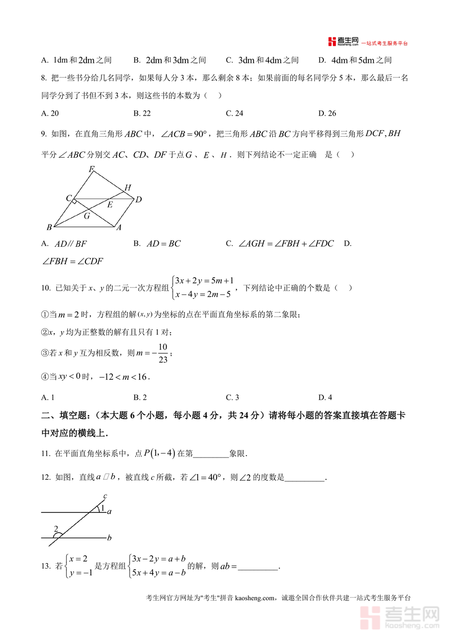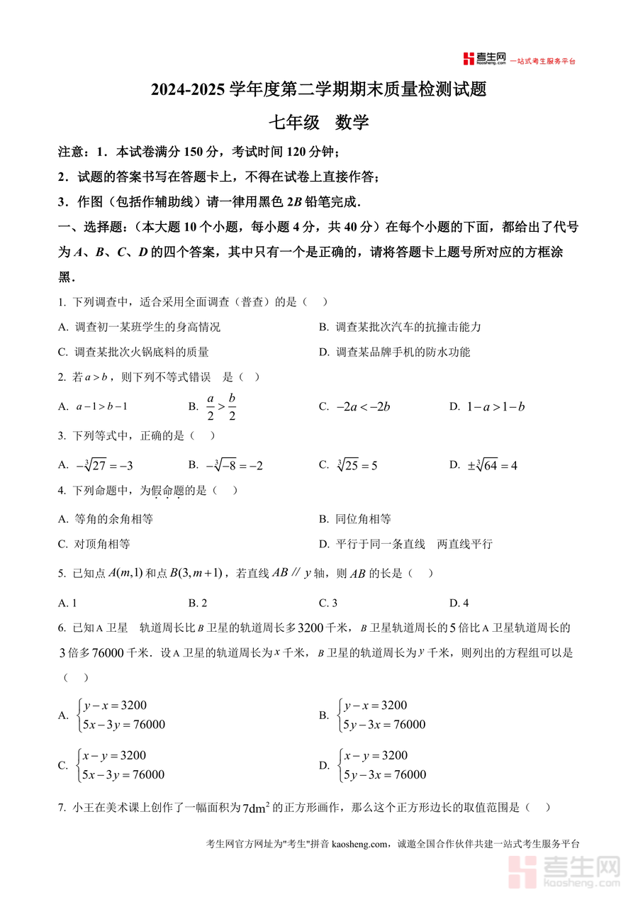 《精品解析:重庆市合川区2024-2025学年七年级下学期数学期末试题(原卷版)》是一份聚焦区域期末检测需求的权威真题资料,完整呈现了该学年合川区七年级数学期末考的试题原貌与命题结构。资料包含满分150分、时长120分钟的考试说明,以及覆盖选择题(10题40分)、填空题(6题24分)、解答题(9题86分)的全题型内容。其特色亮点在于严格保留官方试题排版与考点分布逻辑,涵盖统计调查类型判断、不等式性质应用、幂运算规则辨析、几何命题真假判断等七年级下册核心知识点,能精准反映区域教学重点与命题趋势。