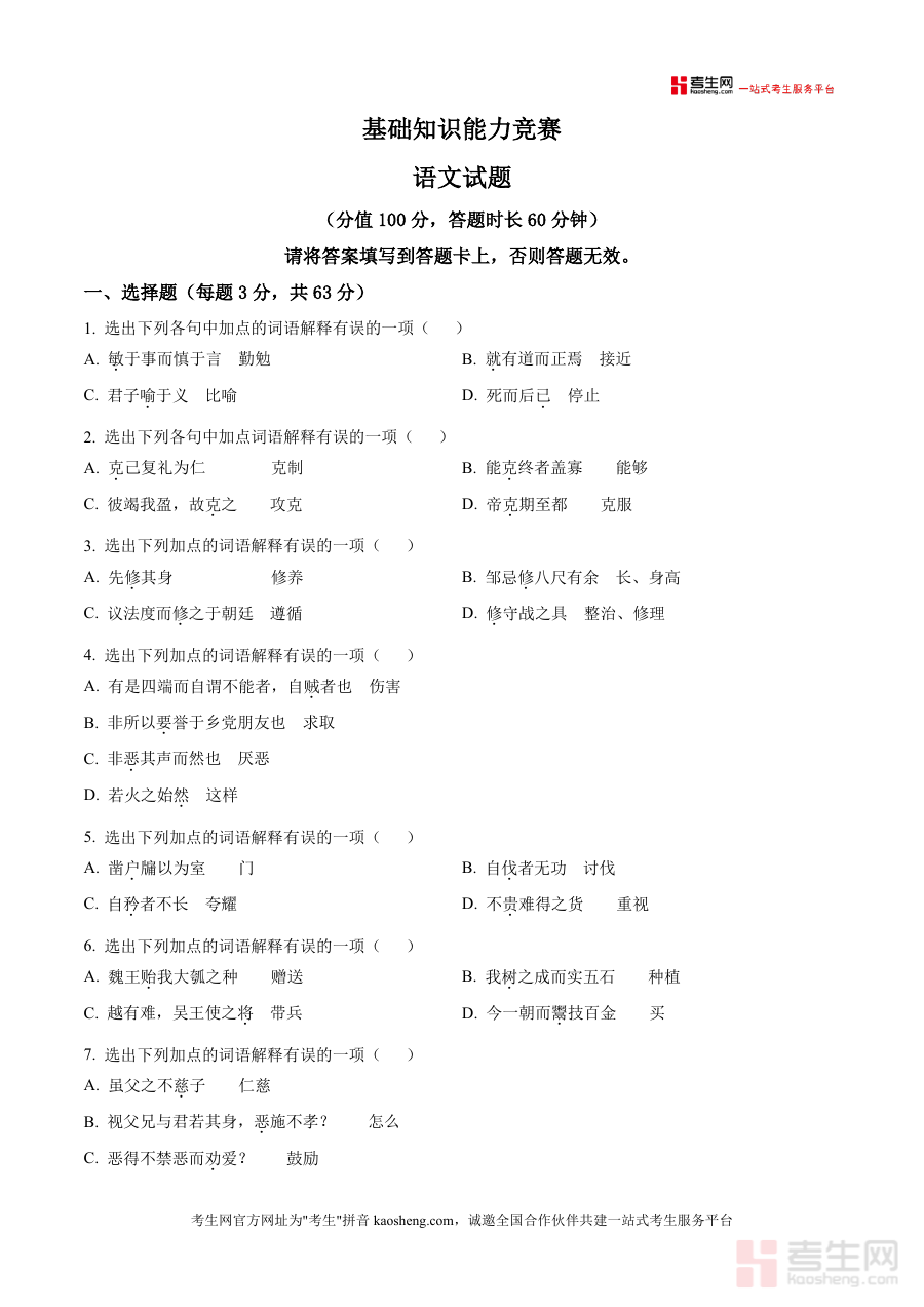 该资料核心用途在于帮助高三学生进行自我检测,快速定位文言基础薄弱环节,巩固高考高频考点;教师可将其作为课堂练习或单元测试素材,评估学生暑期复习效果;家长也能通过该试卷了解孩子学习进度与不足。使用场景包括新学期开学初的课堂检测、课后针对性训练以及模拟考试前的热身练习,用户通过完成试卷可提升文言阅读能力与应试技巧,掌握高考语文常见题型解法,为后续系统备考奠定坚实基础。