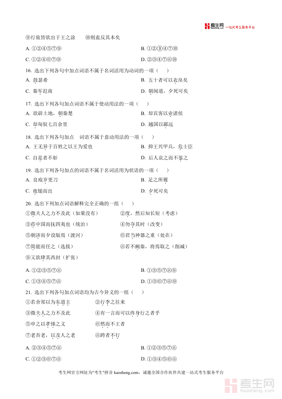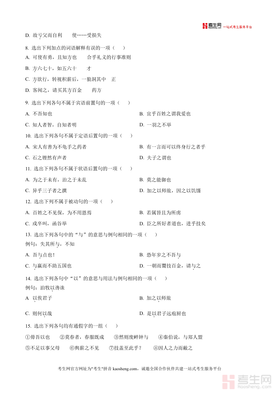 《精品解析:江苏省连云港市灌云县杨集高级中学2025-2026学年高三8月月考语文试题(原卷版)·docx》是一份针对高三学生语文备考的阶段性检测资料,聚焦高考核心考点,涵盖文言实词虚词辨析、文言句式判断、词类活用分析、文言文阅读(断句、文化常识、翻译)及名句名篇默写等关键模块,题型设置贴合高考命题趋势,能精准反映该校高三学生新学期初始阶段的语文基础水平与知识掌握情况,为后续教学与备考提供明确方向。