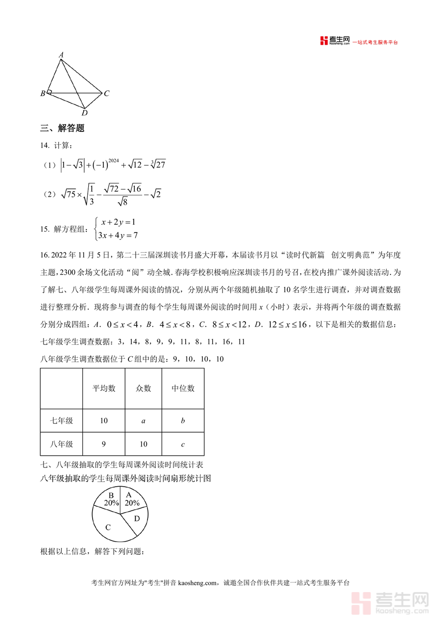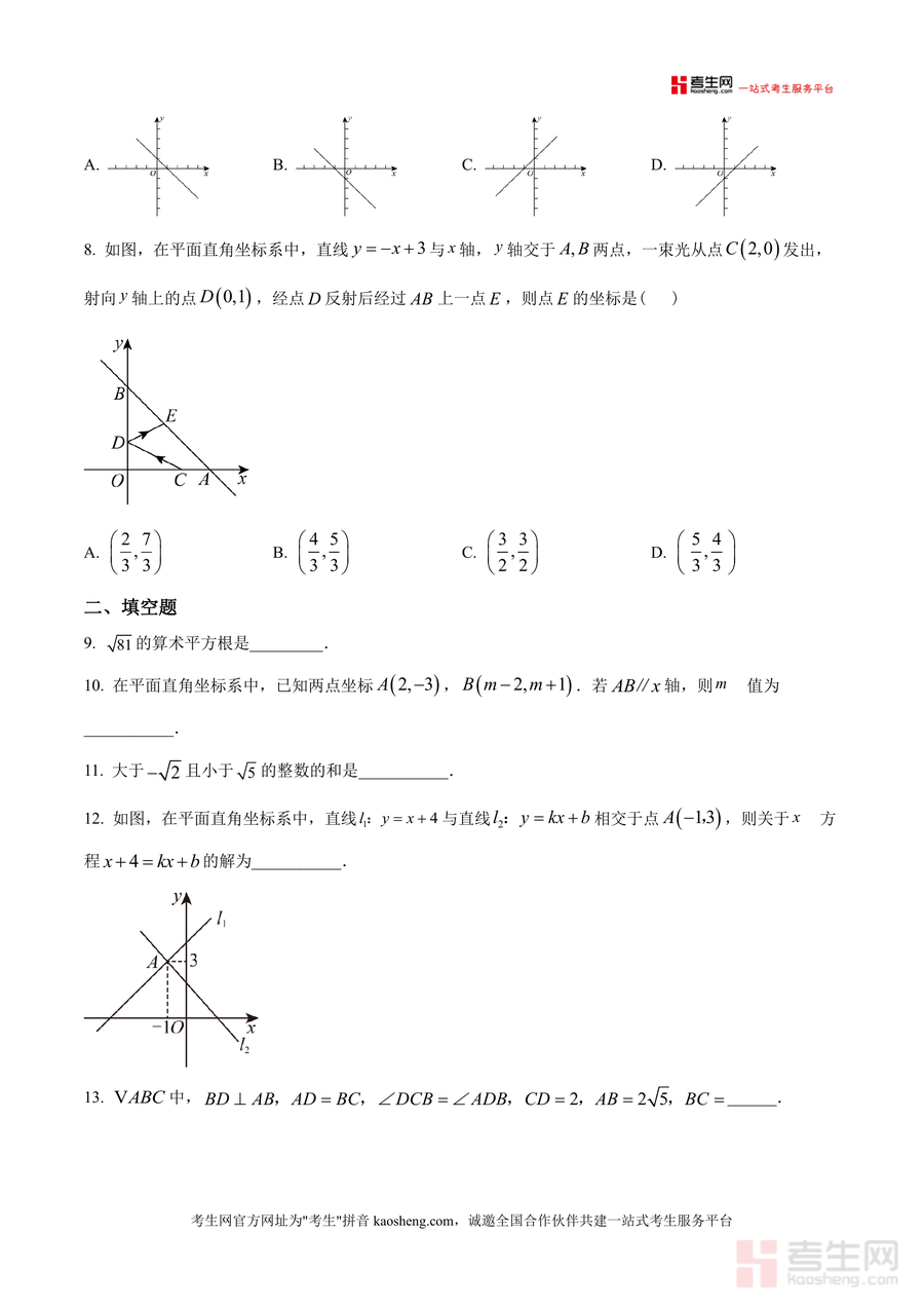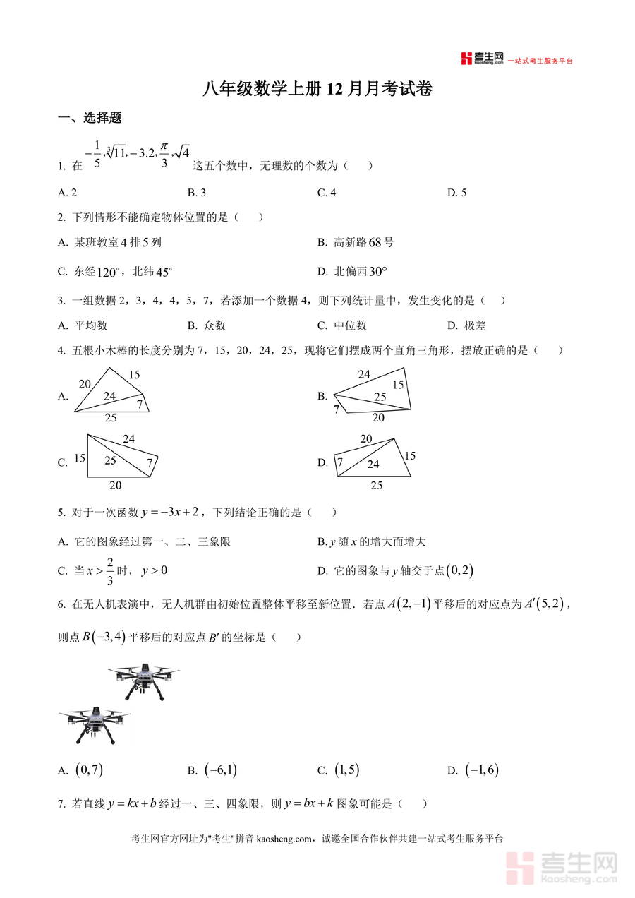 《精品解析:广东省深圳市宝安区实验学校 2025-2026学年上学期八年级上学期数学十二月月考卷(原卷版).docx》是一份精准对接深圳宝安区实验学校八年级上册数学教学进度与月考命题要求的权威原卷资料。该试卷涵盖选择题、填空题、解答题三大核心题型,内容覆盖无理数识别、平面直角坐标系中点位置确定、统计量(平均数、众数、中位数等)变化分析、直角三角形判定(勾股定理应用)、一次函数图象与性质、坐标系平移与反射规律、二元一次方程组求解、课外阅读数据统计分析、实际问题建模(如测温时间应用题)、函数探究及几何动点问题等八年级上册数学核心知识点。其特色在于严格遵循该校教学大纲与命题风格,题型设置全面且具有代表性,能真实反映学生对阶段知识的掌握情况。