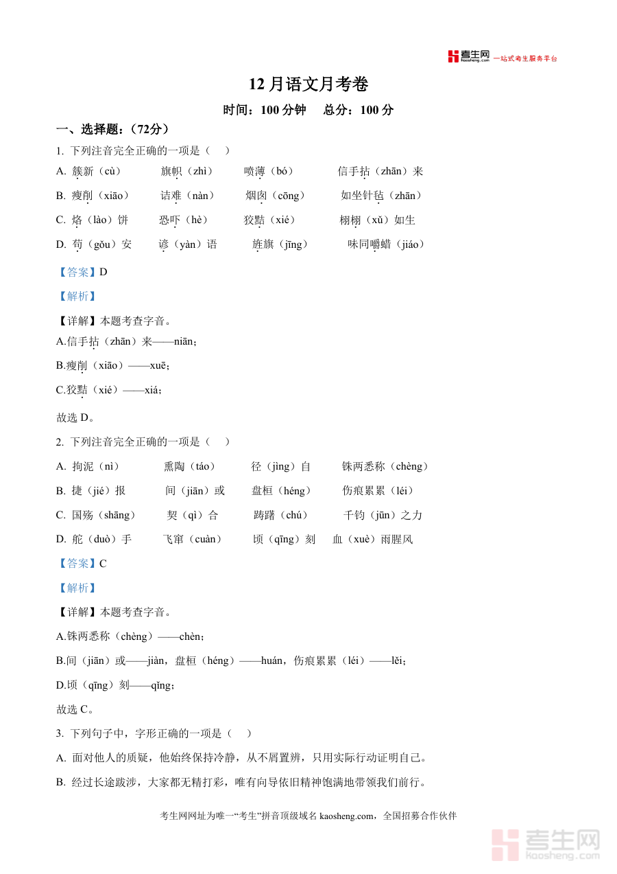 《精品解析:山东省青岛市即墨区实验学校2025-2026学年七年级上学期12月月考语文试题(解析版)(1).docx》是一份针对七年级上学期语文阶段性学习评估的专业备考资料,聚焦本地实验学校12月月考真题展开深度解析。资料涵盖字音字形辨析、成语运用判断、句子排序与语病修改等核心题型,每个题目均配备精准答案及详尽解析——不仅明确正确选项,更针对错误选项逐一剖析成因(如字音误读、字形混淆、成语误用等),同时关联教材知识点,帮助使用者厘清考点逻辑。其特色在于贴合青岛即墨区学情,真题代表性强,解析注重方法引导而非单纯给出结论,为备考提供扎实支撑。
