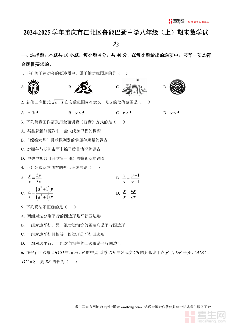 《精品解析:重庆市江北区鲁能巴蜀中学2024-2025学年上学期八年级期末数学试卷(原卷版)》是一份面向重庆江北区八年级学生及教师的期末数学备考核心资料,主要内容包含选择题(10小题)、填空题(8小题)、解答题(9小题)三大题型,覆盖轴对称图形判断、二次根式有意义条件、普查与抽样调查区分等基础知识点及平行四边形性质应用、分式方程求解等综合能力考查模块;其特色亮点在于以名校原卷形式呈现命题思路,题型设置贴合本地教学大纲与期末考要求,完整保留考试原题结构与分值分布。