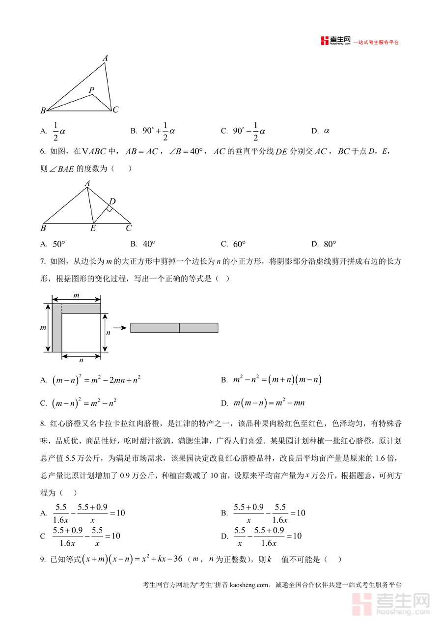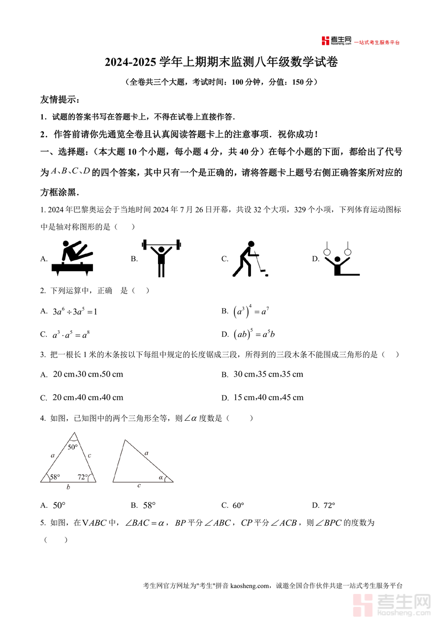 《精品解析:重庆市江津区2024-2025学年上学期期末监测八年级数学试卷(原卷版).docx》是一份贴合区域教学实际、聚焦八年级数学核心考点的标准化期末监测真题资料。该资料严格复刻江津区官方期末统考原卷结构,包含选择题(10题)、填空题(8题)、解答题(8题)三大题型,覆盖轴对称图形识别、整式运算、三角形全等判定与性质、分式方程应用等八年级上册核心知识点;特色在于融入巴黎奥运会时事素材、江津红心脐橙产业等本地化元素设计应用题,题型难度梯度与考试大纲高度匹配,能真实反映区域命题方向。