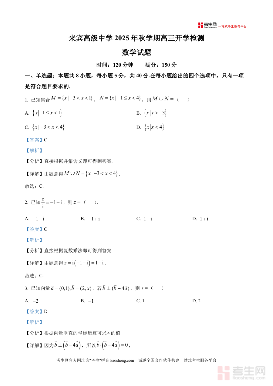 《精品解析:广西壮族自治区来宾高级中学2025-2026学年高三上学期开学检测数学试题(解析版)》是一份针对高三开学阶段知识掌握情况评估与能力提升设计专业真题解析资料。其内容覆盖集合与逻辑、复数运算、向量应用、数列性质、立体几何、导数综合等高中数学核心考点,包含单选题8道、多选题3道、填空题3道及解答题5道完整试题与详细解析。特色亮点在于每道题配备多解法(如第6题台体体积与线面角两种解法)、关键思路点睛(如第14题概率问题转化为随机变量期望分析)及考点延伸提示,贴合广西来宾高中教学实际与学情特点,确保解析深度与实用性兼备。