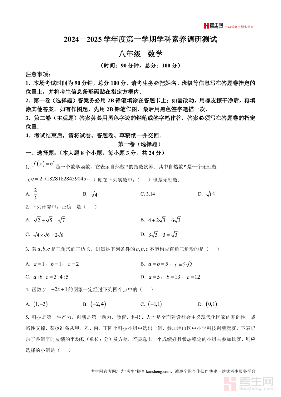 《精品解析:广东省深圳市坪山区2024-2025学年八年级上学期期末数学试题(原卷版).docx》是一份针对坪山区八年级学生期末数学备考设计的权威真题资料。该资料完整呈现了本地学科素养调研测试原卷内容,涵盖选择题(8小题24分)、填空题(5小题15分)、解答题(7小题61分)三大题型,覆盖无理数判定、函数图象分析、直角三角形性质、方程组应用等核心知识点。其特色在于严格贴合本地考试标准,明确标注90分钟时长与100分总分,详细说明答题卡填涂及答题规范,为使用者提供真实考试情境,是兼具权威性与实用性的备考资料。