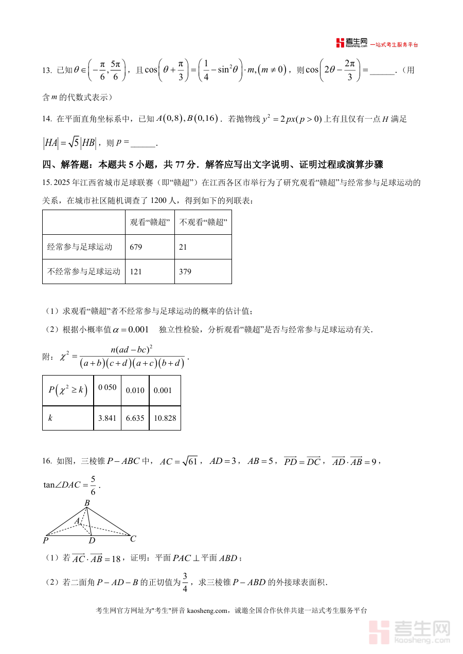 本资料适用于江西省2026届高三学生、高中数学教师及高考辅导机构人员。作为入学阶段的关键诊断工具,它能帮助使用者快速把握数学学习现状,是一轮复习启动前不可或缺的参考资料;其地方特色与考情贴合度使其具有不可替代性,能让使用者更精准地对接本地高考要求;长期来看,该试卷可作为一轮复习过程中的阶段性检测素材,持续助力使用者巩固知识体系与提升解题能力,为最终高考备考奠定坚实基础。