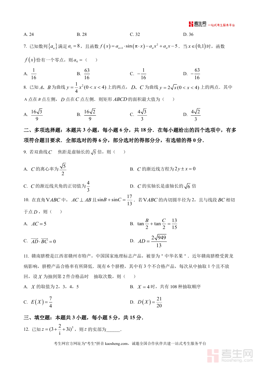 《精品解析:江西省2026届高三上学期8月入学摸底考试数学试题(原卷版).docx》是一份针对江西省2026届高三学生入学阶段数学能力评估的专业备考资料。该资料严格遵循江西省高考数学命题框架与难度梯度设计,包含单项选择题(8小题,40分)、多项选择题(3小题,18分)、填空题(3小题,15分)及解答题(5小题,77分)四大题型,全面覆盖集合与常用逻辑用语、数列、函数性质与导数、立体几何、解析几何、概率统计等高中数学核心知识模块,且融入赣南脐橙产业相关实际应用情境(如概率题),体现地方特色与学科融合。其原卷版呈现方式完整还原考试场景,包含规范答题卡使用说明及分值分布,便于使用者模拟真实考试流程。