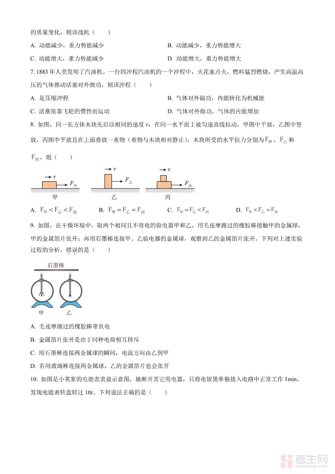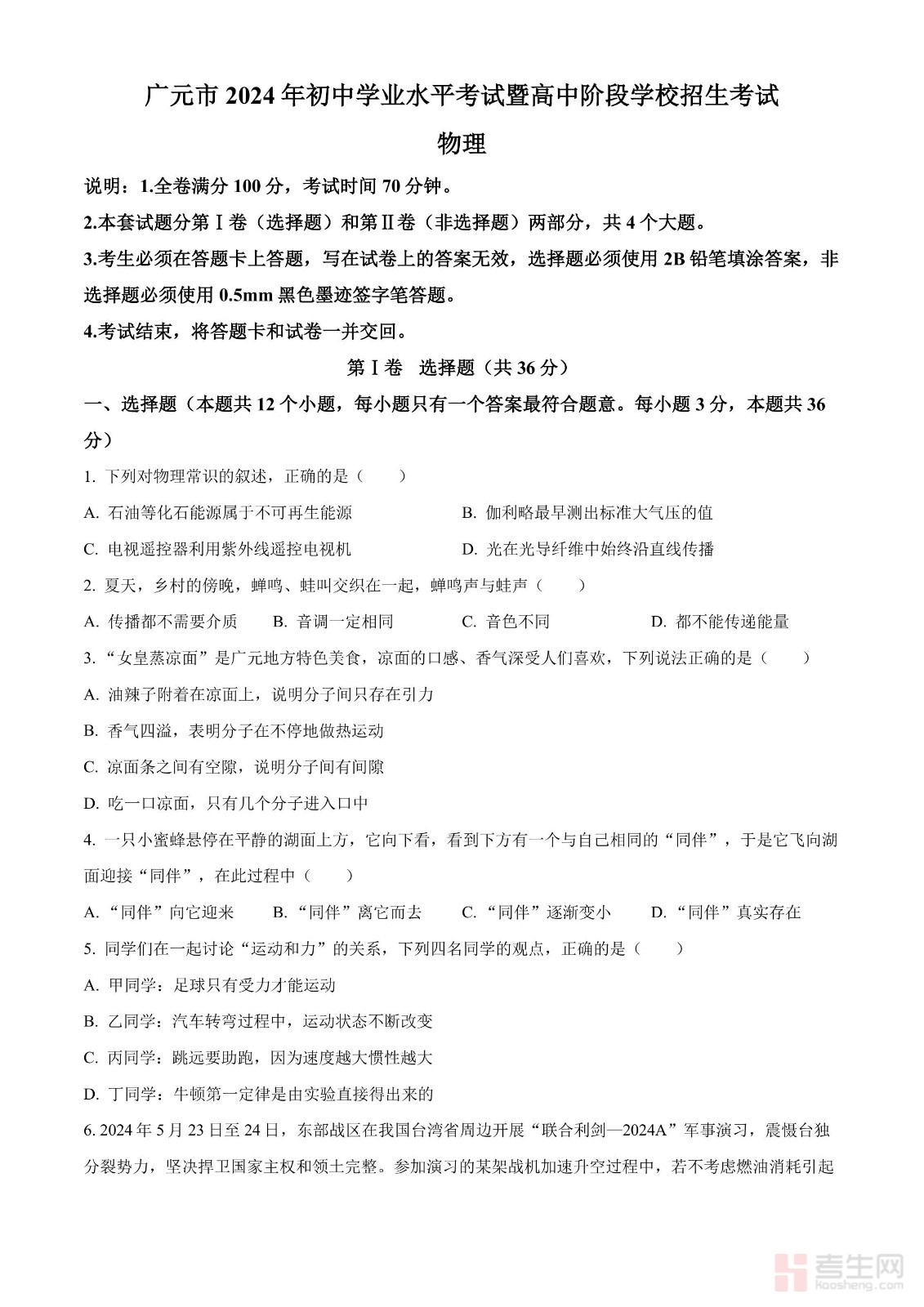 2024年四川省广元市中考物理试题(原卷版)