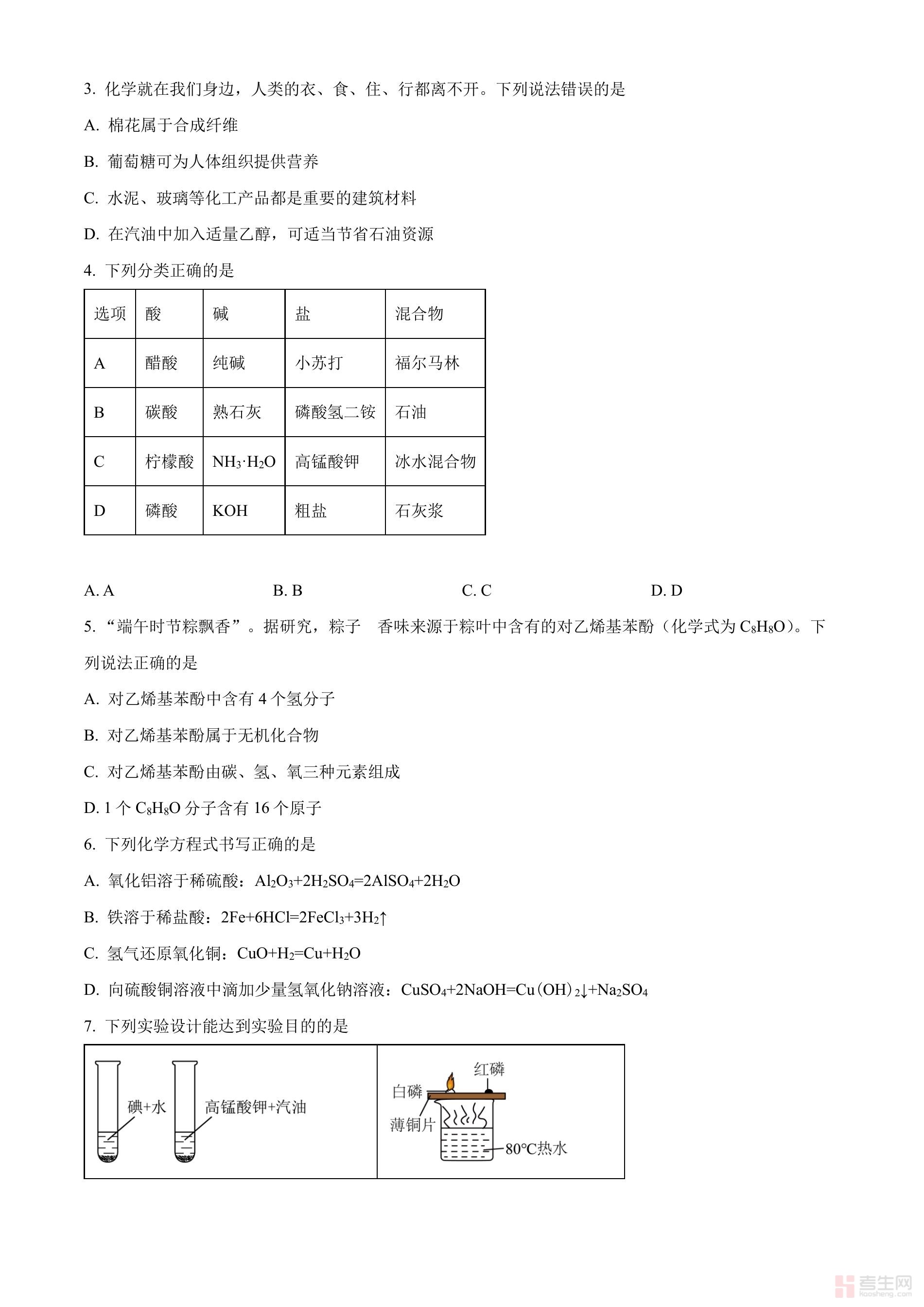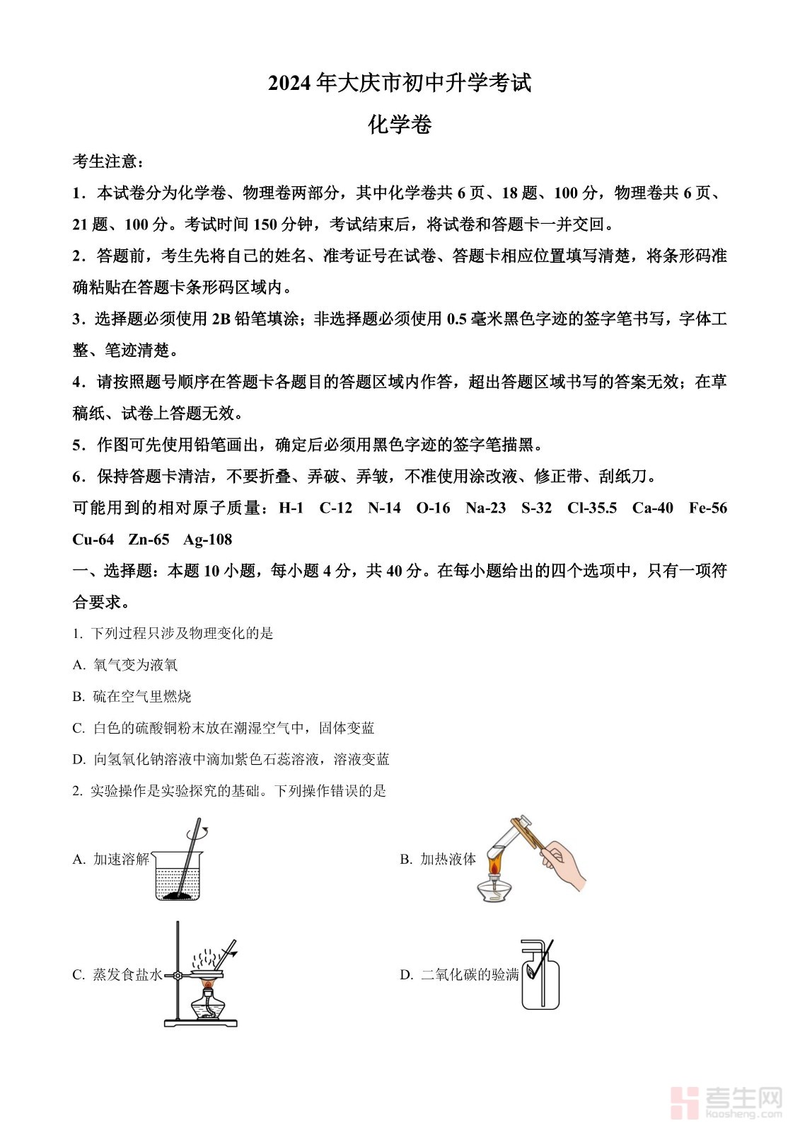 2024年黑龙江省大庆市中考化学真题(原卷版)