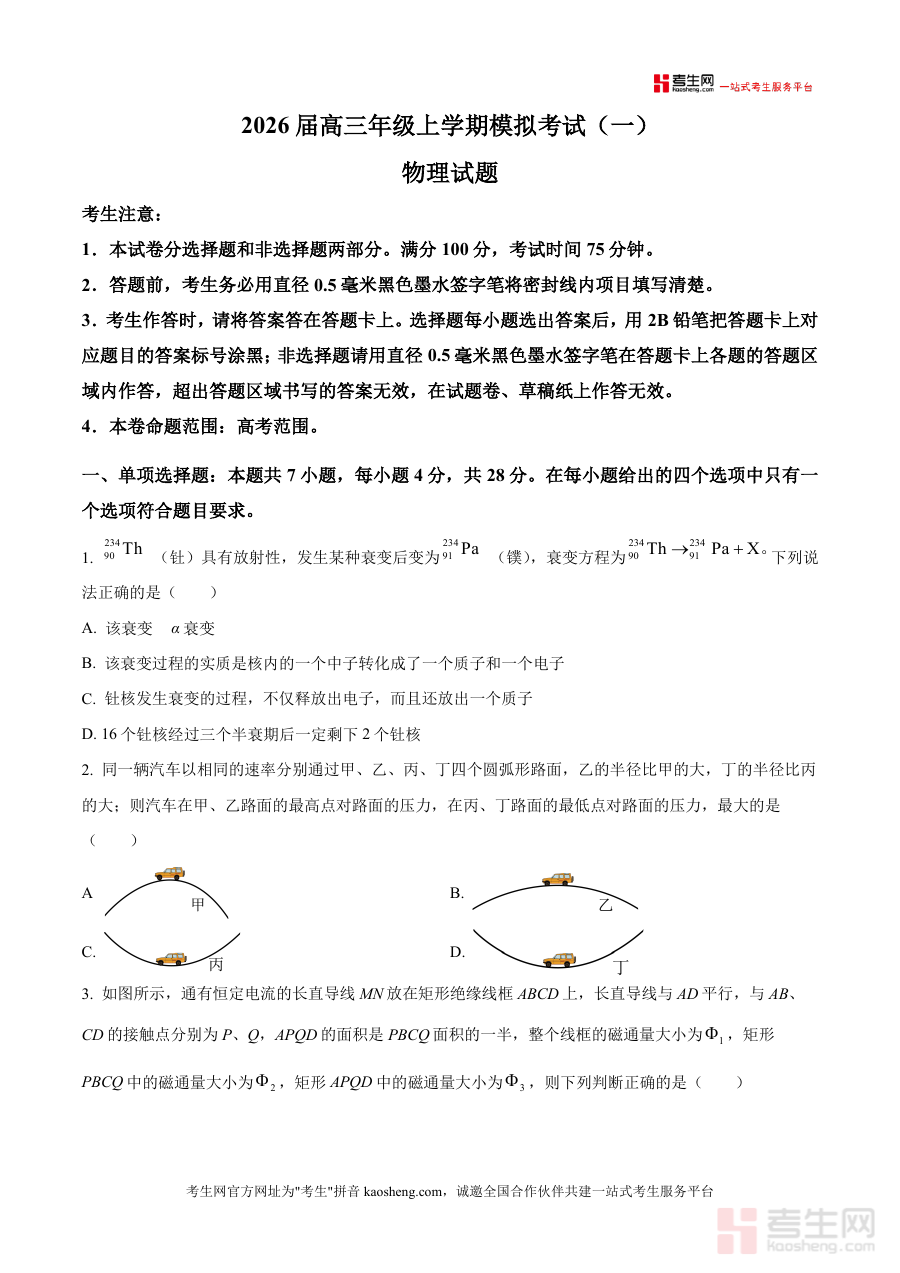 《精品解析:2026届河北省名校联考高三上学期一模物理试题(原卷版)》是一份面向2026届河北省高三学生物理学科一轮复习阶段设计的权威模拟试题资料,核心定位为名校联合命制、贴合河北高考命题趋势且严格遵循高考范围要求的原卷版检测工具。主要内容包含单项选择题7道(共28分)、多项选择题3道(共18分)及非选择题5道(共54分)三大模块,覆盖原子核衰变规律、圆周运动受力分析、电磁感应现象应用、简谐运动与电场综合、交变电流有效值计算等高考高频考点;特色亮点在于试题由河北省多所顶尖高中联合研发,题型结构、分值分布与河北高考物理试卷高度一致,完整保留原卷规范性作答要求与试题表述细节,具备真题级别的参考价值。
