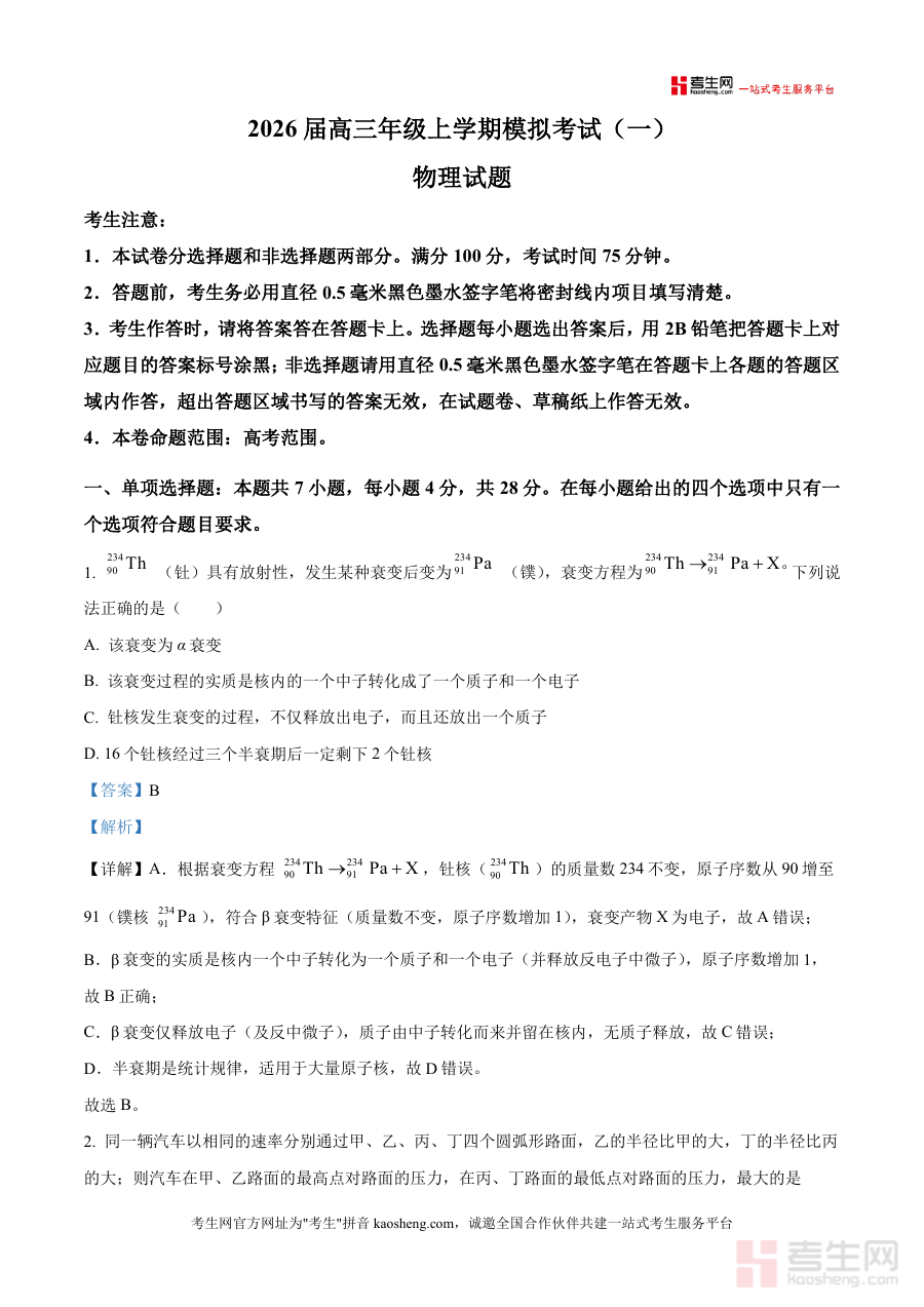 《精品解析:2026届河北省名校联考高三上学期一模物理试题(解析版)》是一份针对河北高三物理备考阶段精准设计的权威真题解析资料。文件包含完整试题及每道题目的深度剖析,覆盖单项选择、多项选择、非选择等高考核心题型(如β衰变实质判断、圆周运动向心力分析、电磁感应中的动量定理应用等);解析部分不仅明确答案,还通过分步推导梳理解题逻辑,融入核心考点关联(如衰变类型特征、全反射临界角计算等),突出真题解析专业性与考点针对性,助力学生理解知识本质与解题规律。