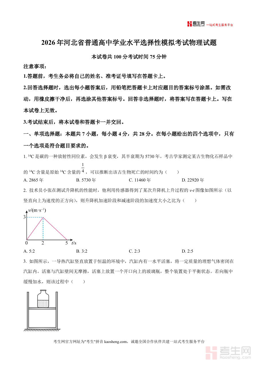 《精品解析:2026届河北省唐县第一中学高三上学期一模物理试题(原卷版)》是一份针对高三学生物理备考设计高质量模拟考试资料,核心定位贴合河北省学业水平选择性考试要求、反映唐县一中教学特色阶段性测评工具主要内容涵盖单项选择多项选择及非选择三大题型共16道题目涉及原子核衰变运动学图像分析理想气体状态变化自耦变压器原理受力平衡计算抛体运动规律磁约束核聚变等高中物理核心知识模块特色亮点在于严格遵循75分钟考试时长与100分分值设置并融入近年高考热点题型如磁约束技术应用火星探测器轨道分析等兼具知识覆盖全面性与命题前瞻性