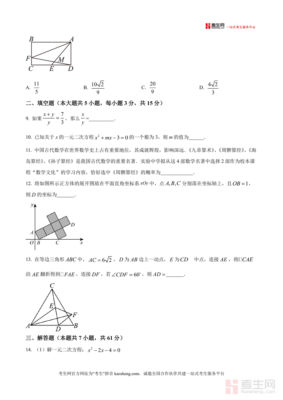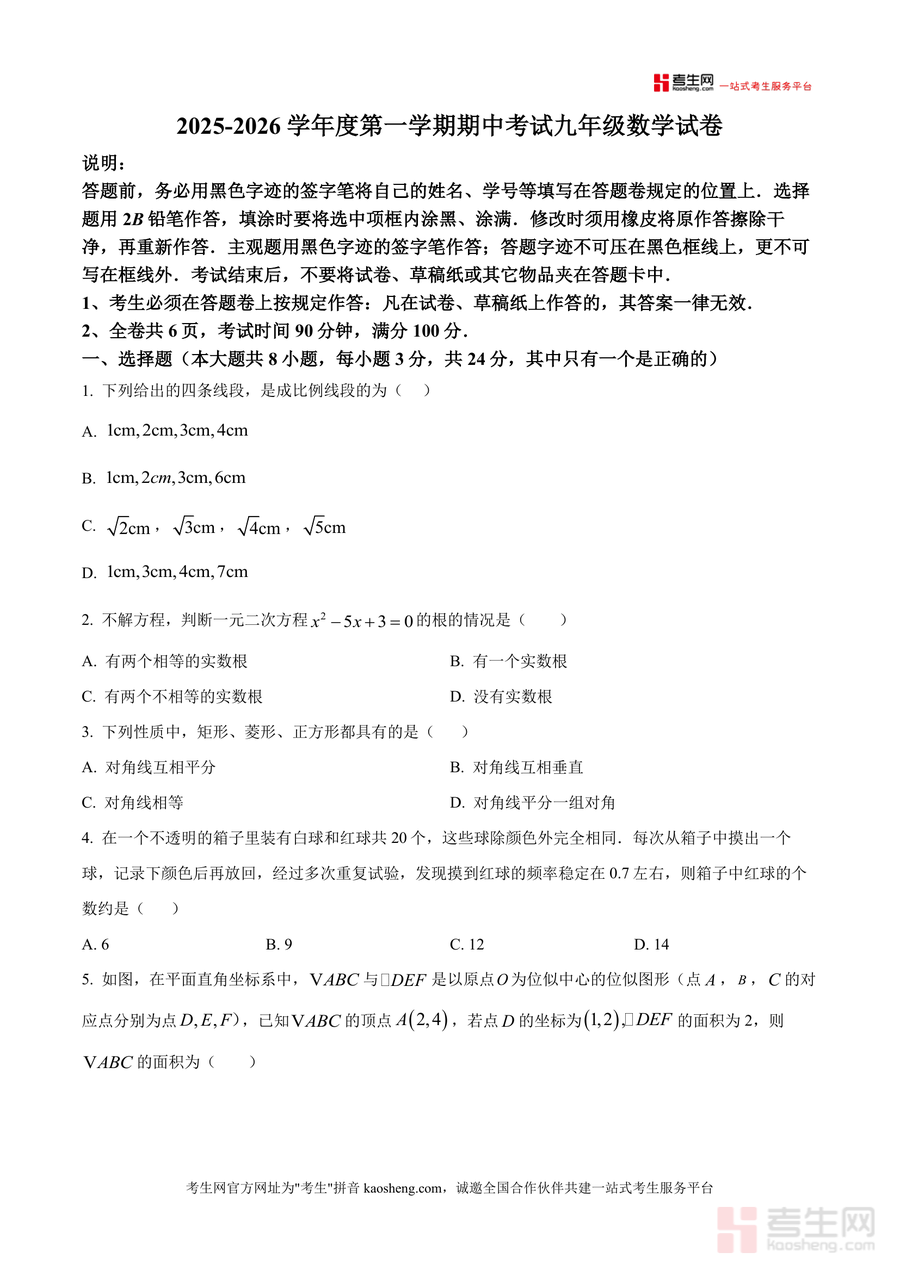 《精品解析:广东省深圳市福田区外国语学校(集团)2025-2026学年九年级上学期期中数学试卷(原卷版).docx》是一份聚焦深圳福田区外国语学校集团九年级学生期中数学备考需求的专业资料。该资料完整还原了该校期中数学试卷的原卷结构与答题规范,包含选择题(8小题,24分)、填空题(5小题,15分)、解答题(7小题,61分)三大题型模块,内容覆盖比例线段判定、一元二次方程根判别式、特殊四边形性质、概率计算、位似图形应用等核心知识点,贴合该校教学进度与学情特点,为备考资料中的精准性范例。