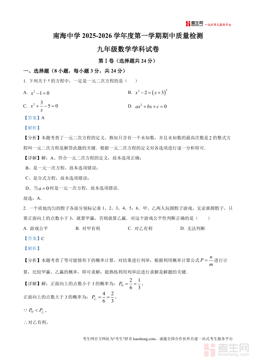 《精品解析:广东省深圳市南山实验教育集团南海学校2025-2026学年九年级上学期期中考试数学试题(解析版).docx》是一份针对广东省深圳市南山实验教育集团南海学校2025-2026学年九年级上学期期中考试数学科目的专业备考资料。该资料对应学校该学年第一学期期中质量检测环节,完整呈现了本次考试数学试题及配套详细解析内容,为使用者提供了与校内期中检测直接相关的参考素材。