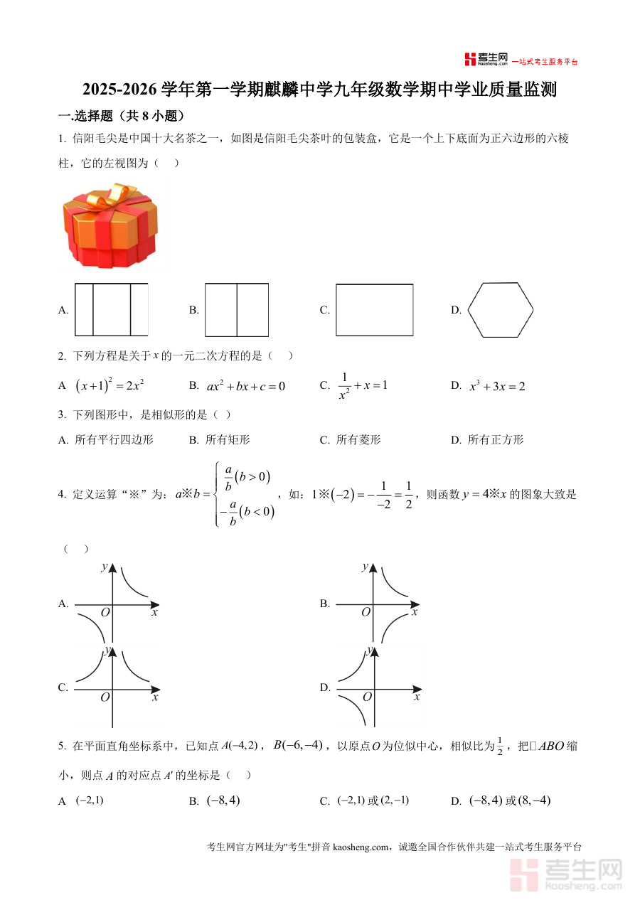 适用人群为广东省深圳市南山实验教育集团麒麟中学2025-2026学年上学期九年级学生及数学学科教学辅导人员。作为阶段检测性质原卷资料,它对学生掌握自身学习进度、调整复习策略具有直接参考价值,也能帮助教师精准把握学情,优化教学安排,助力提升期中复习效率与教学质量。
