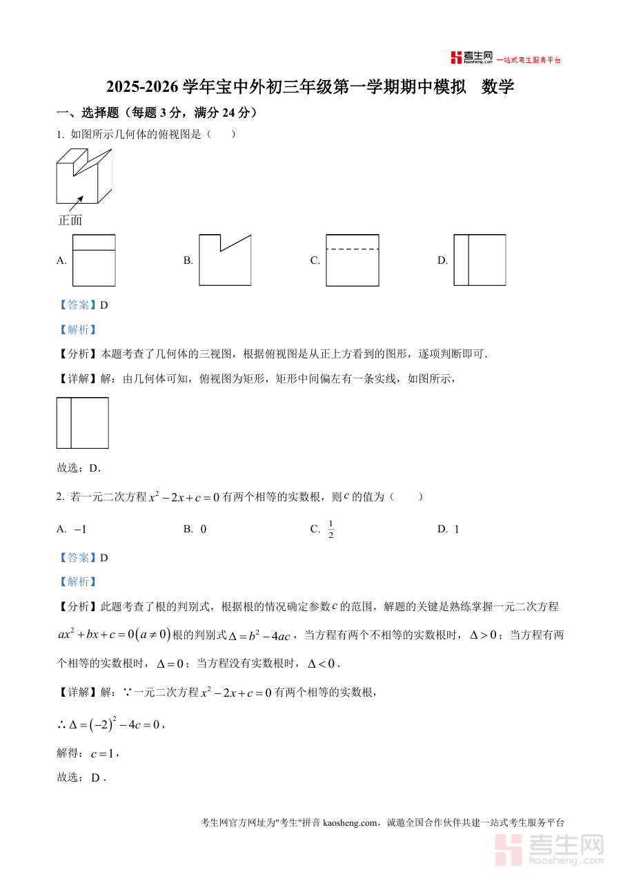 《精品解析:广东省深圳市宝安中学外国语学校(集团)2025-2026学年上学期九年级期中模拟考试数学试卷(解析版).docx》是一份针对广东省深圳市宝安中学外国语学校(集团)九年级学生在2025-2026学年上学期期中阶段开展数学模拟考试后使用解析类备考资料。该资料严格依托文件元信息中标注考试时间、学校归属及考试类型属性编制,核心内容对应模拟考试试卷题目的解析呈现,不涉及任何未明确提及具体知识点或题型细节,仅作为特定考试场景下配套解析资料存在,匹配该校期中阶段数学学科检测需求。