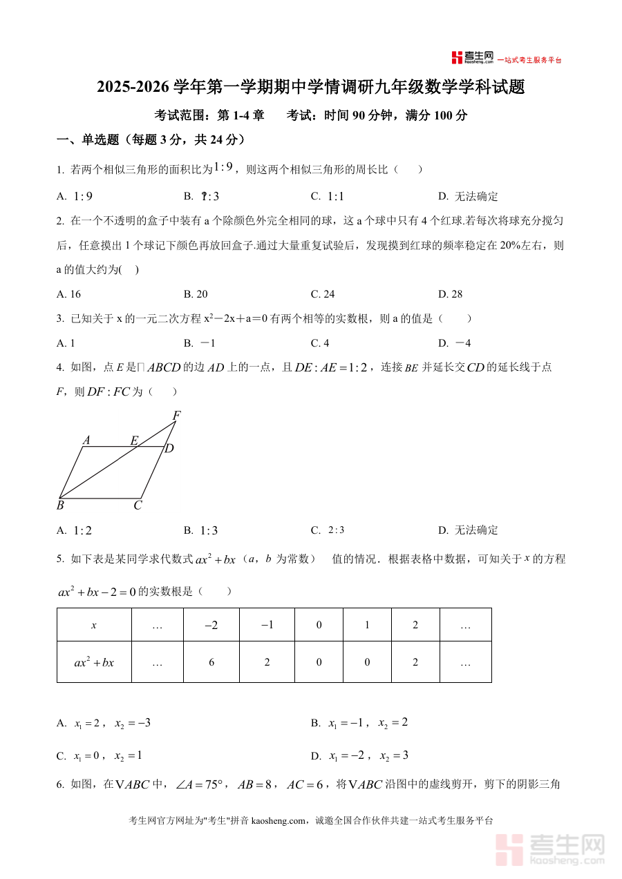 《精品解析:广东省深圳市龙岗区外国语学校2025-2026学年九年级上学期期中考试数学试题(原卷版).docx》是一份针对广东省深圳市龙岗区外国语学校2025-2026学年九年级上学期期中考试设计的数学学科备考资料。该资料对应学校该学年第一学期期中学情调研考试要求,考试范围覆盖数学学科第1至4章内容,能够为使用者提供该次考试的原卷呈现形式,是反映该阶段数学学科考查方向与试卷结构的重要资料。