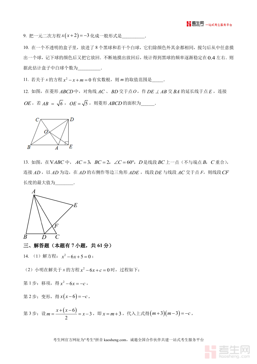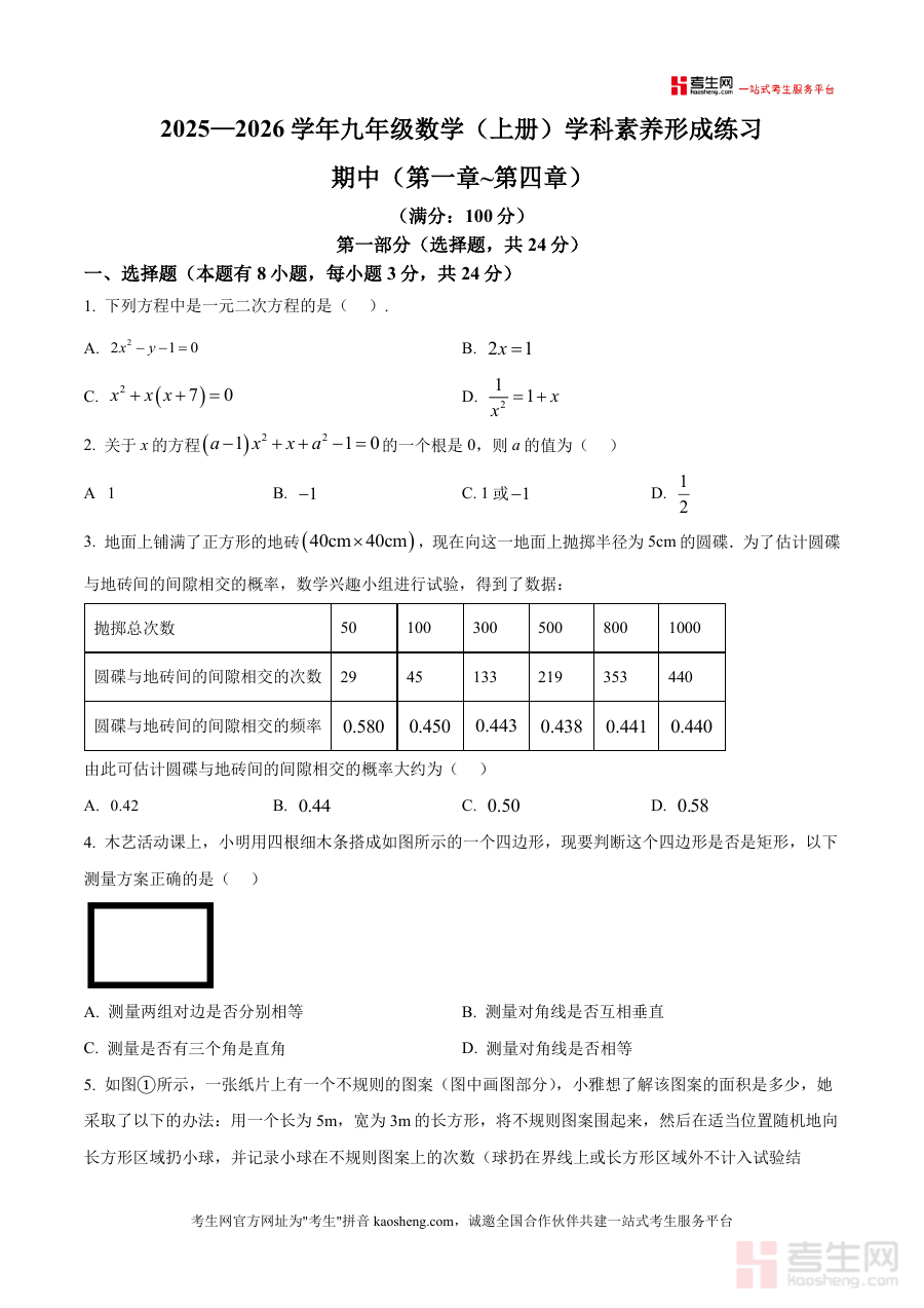 《精品解析:广东省深圳市龙岗区宏扬学校2025-2026学年九年级上学期11月期中数学试题(原卷版).docx》是一份针对广东省深圳市龙岗区宏扬学校2025-2026学年九年级上学期11月期中考试设计的数学学科原卷资料。该资料对应九年级数学上册第一章至第四章学科素养形成练习范围,符合该校期中阶段教学检测需求,直观呈现本次期中考试数学科目的试卷结构与考查方向框架,为相关使用者提供与实际考试一致形式及范围参考依据,是反映该学期中期数学学习成果评估标准的重要载体之一。