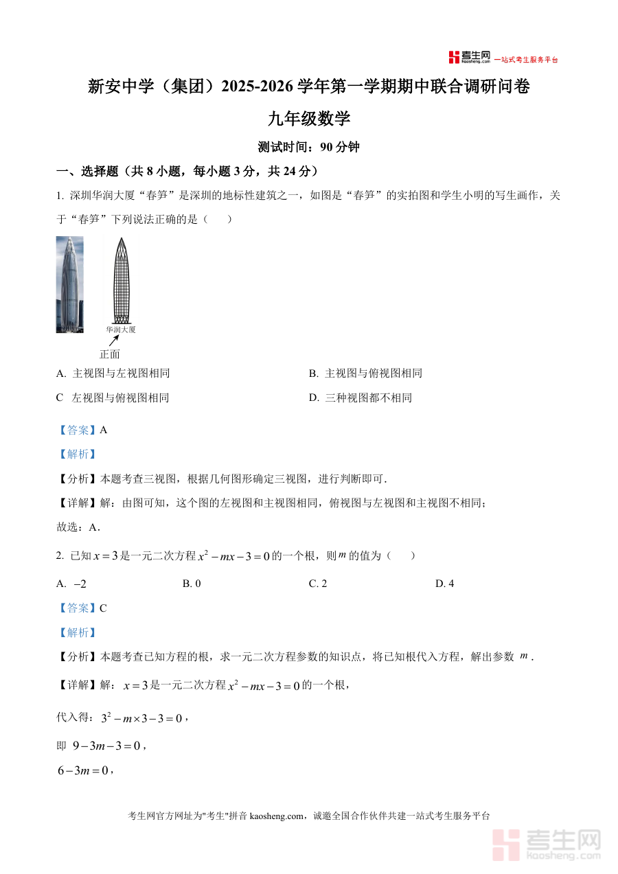 《精品解析:广东省深圳新安中学2025-2026学年上学期九年级数学期中试卷(解析版)》是一份针对广东省深圳新安中学2025-2026学年上学期九年级数学期中联合调研考试编制而成的备考资料。该资料对应新安中学集团内同期开展期中联合调研问卷,聚焦九年级上学期数学学科阶段性考查需求,以完整试卷及配套详细解析形式呈现相关内容,贴合本地学校学情特点,为使用者提供精准适配该次考试参考依据。