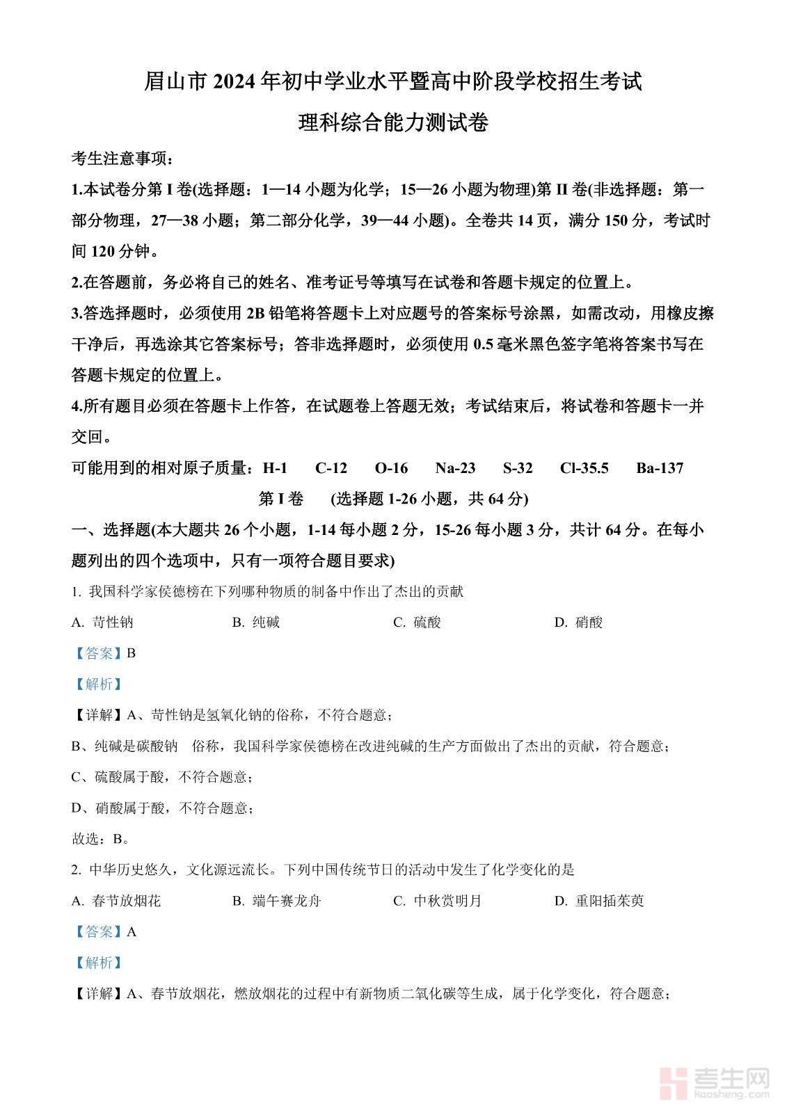 2024年四川省眉山市中考化学真题(解析版)