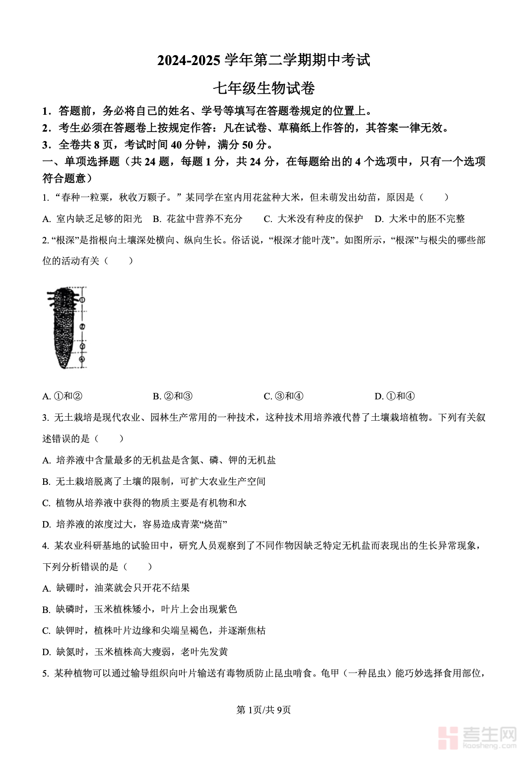 2024-2025 深圳中学七年级(下)期中生物试卷严格对标深圳中学期中命题要求,适配人教版七年级下册生物教材,全面覆盖人的由来、人体营养、消化吸收、青春期发育、被子植物一生等核心考点,贴合深圳本地学情与考试趋势。试卷题型规范完整,包含选择题、填空题、实验探究题、综合分析题,注重考查实验操作、图表解读、逻辑推理、知识应用能力,难度梯度贴合名校水平。内容精准聚焦期中高频考点与易错题型,还原名校考试真实难度与命题思路。适合深圳七年级学生期中备考、模拟演练、查漏补缺、巩固提升使用,助力快速掌握生物核心考点,高效提升应试能力。请添加微信 18617049513 进专属群,获取更多免费资源!