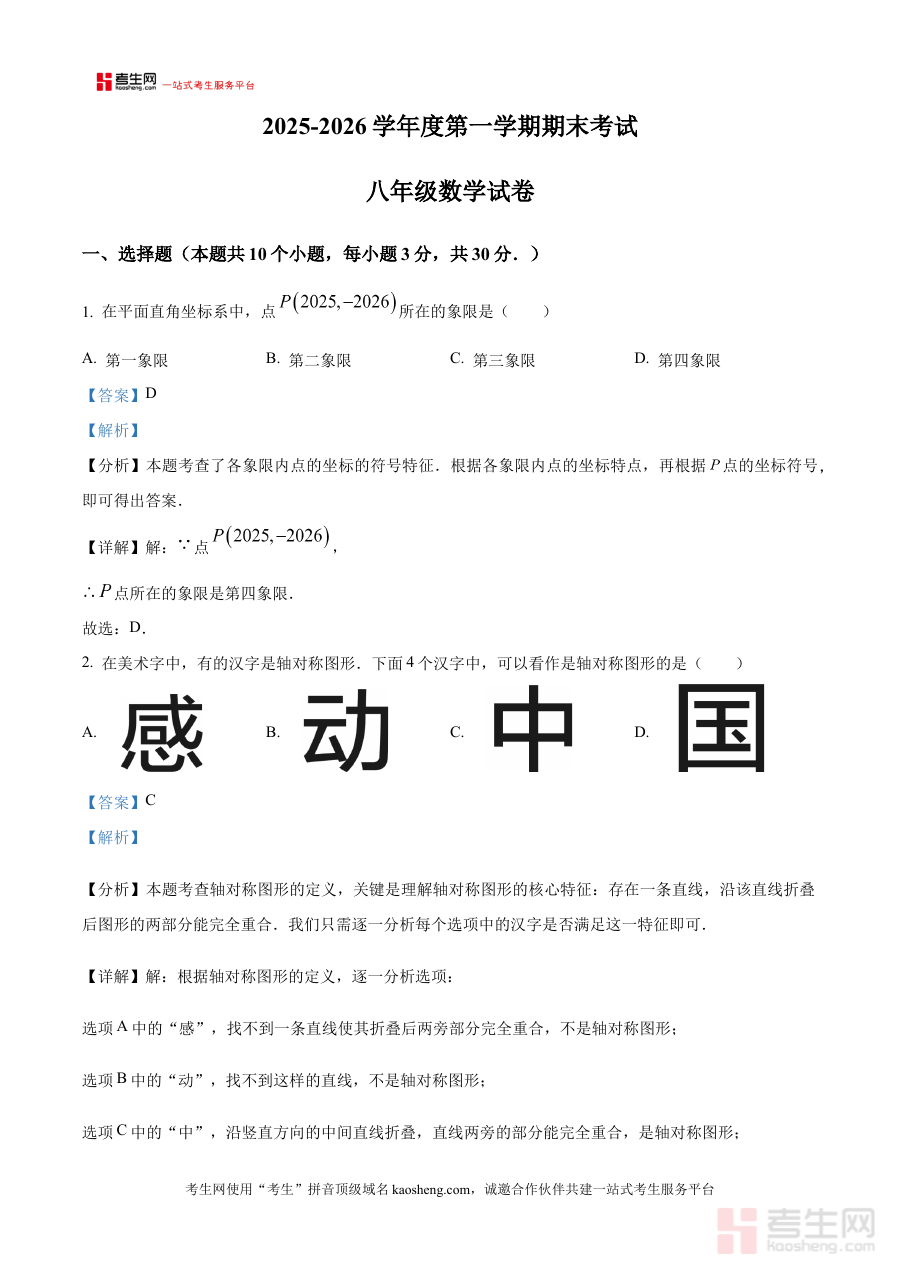 《精品解析:安徽合肥市瑶海区2025-2026学年第一学期八年级期末考试数学试题(解析版)》是面向安徽合肥市瑶海区2025至2026学年第一学期八年级数学期末考试的专业备考资料。该资料紧密贴合当地教育教学阶段性要求,针对该学期期末数学考核的目标与方向展开解析,为使用者提供与考试直接关联的内容支持,帮助其快速把握考试核心背景与重点方向。