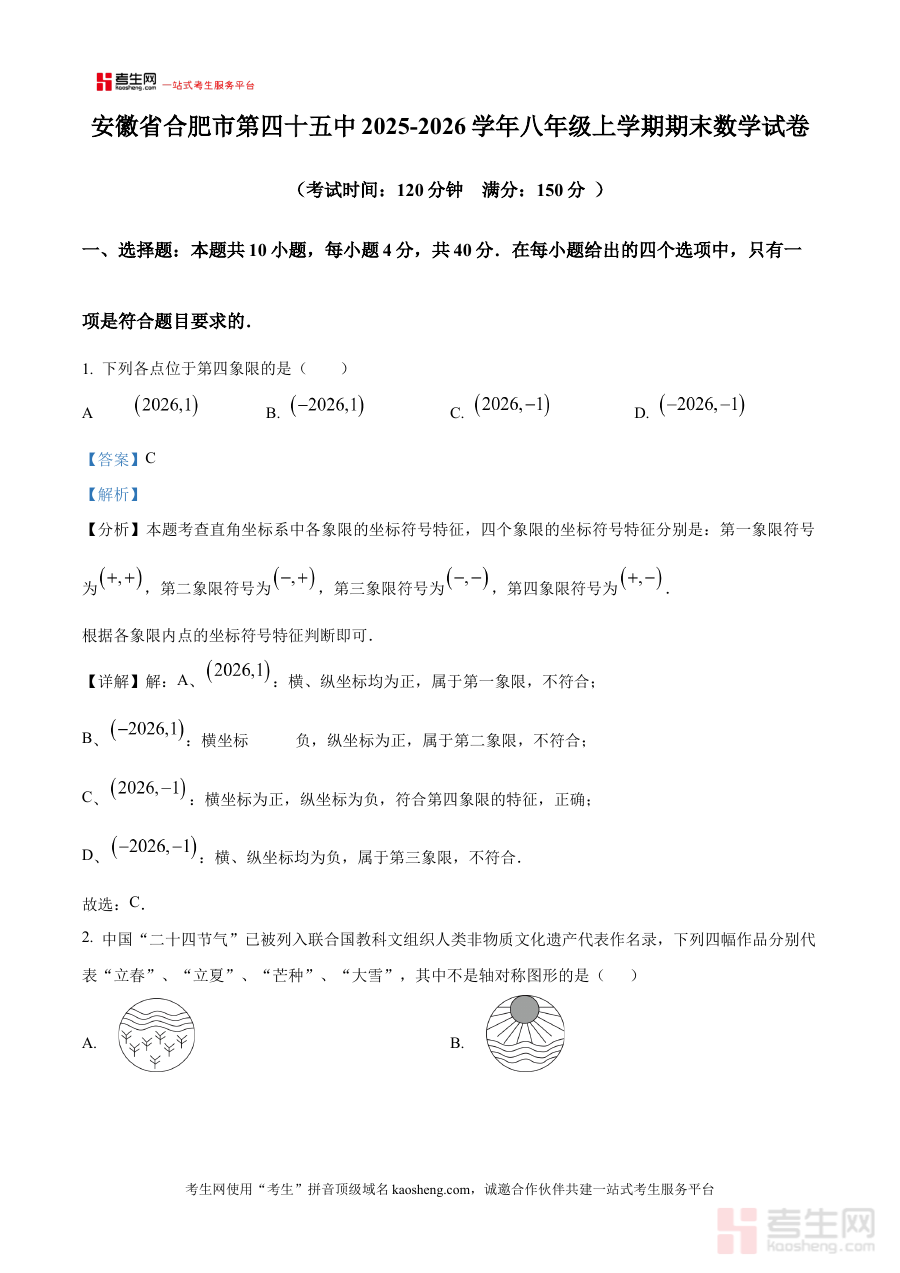 《精品解析:安徽省合肥市第四十五中学2025-2026学年八年级上学期期末数学试卷(解析版)》是针对安徽省合肥市第四十五中学特定学年八年级上学期期末数学考试的专业备考资料。该资料聚焦该校八年级上学期数学期末考核的核心需求,依托正式期末试卷的内容框架,结合解析版的深度解读特性,为使用者提供与该校期末数学考试直接相关的参考依据,帮助使用者精准把握该阶段数学考试的整体方向和考查要求,是贴合该校学情和考试特点的针对性学习资源。