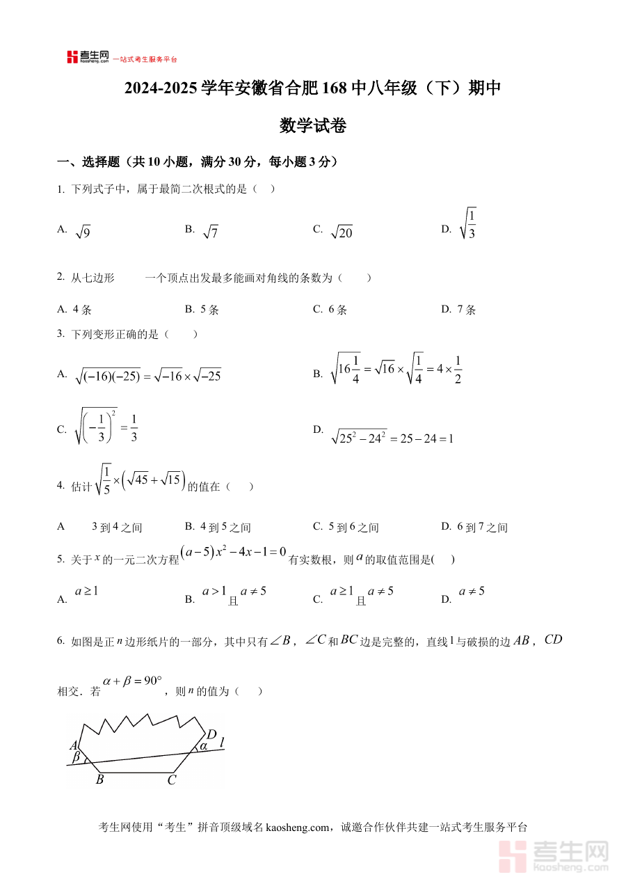 《精品解析:安徽省合肥一六八中学2024-2025学年下学期八年级期中数学试卷 (原卷版)》是面向安徽省合肥市一六八中学特定教学周期的数学阶段性考试资料,精准对应2024-2025学年下学期八年级期中考试这一重要教学节点,为相关使用者提供了贴合该校教学进度、考试标准与命题风格的原卷版本备考资源。作为期中阶段的核心参考材料之一,它能够让使用者直观感受该学校该学期期中考试的试卷结构、题量分布与考查方向,为后续的系统复习与针对性备考提供清晰的方向指引,助力师生更好地把握期中阶段的学习重点与考试要求。