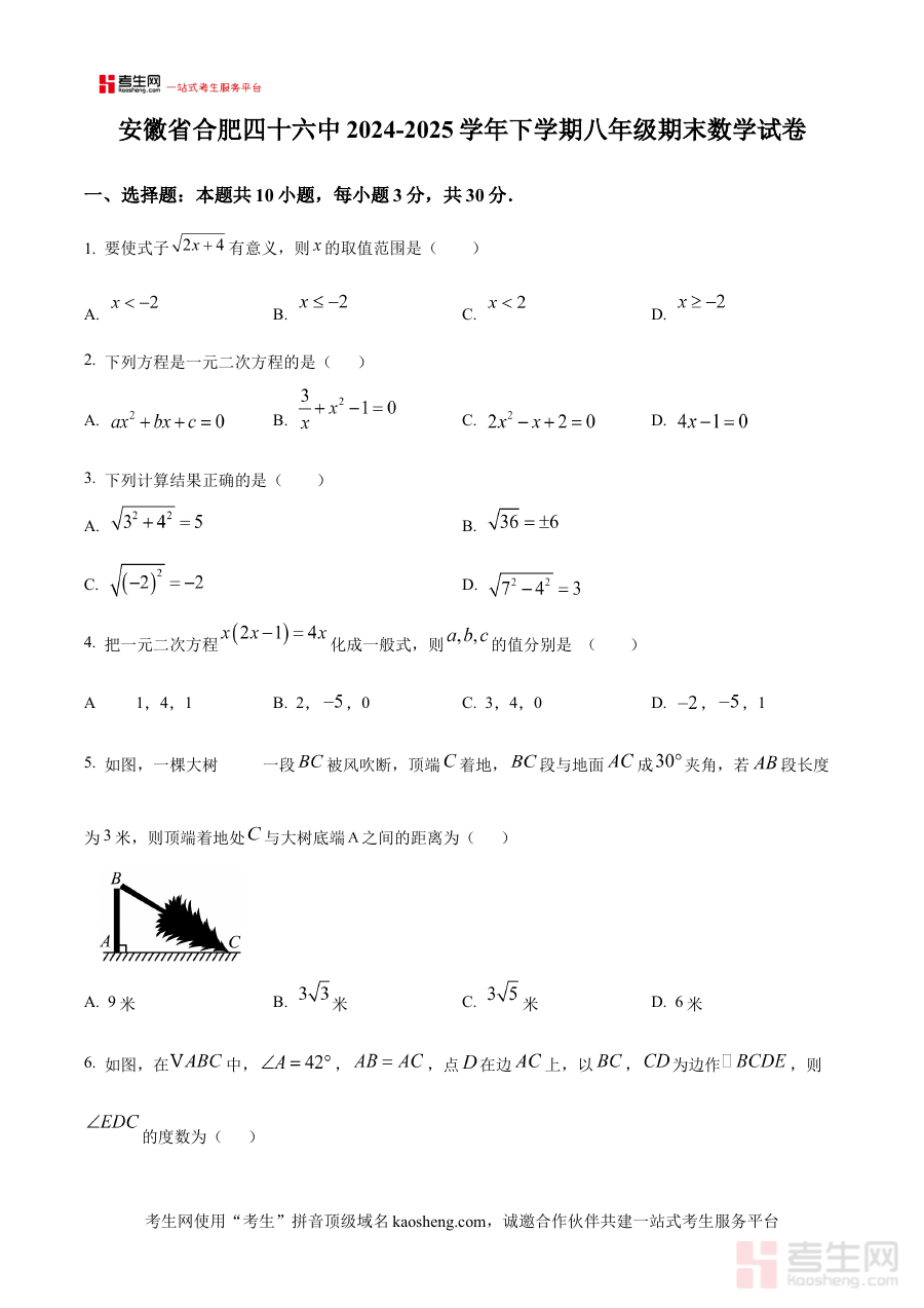 本资料主要适用于安徽省合肥四十六中2024-2025学年下学期的八年级学生及相关数学教师。对学生而言,使用该原卷练习可模拟真实考试场景提升应试技巧与时间管理能力;对教师来说它是期末复习核心参考依据,助力精准把握考试方向、设计针对性教学活动与复习方案以有效指导学生备考。其在阶段检测与备考规划中的核心价值为师生提供真实可靠的考试内容支持,促进教学与学习效果提升。