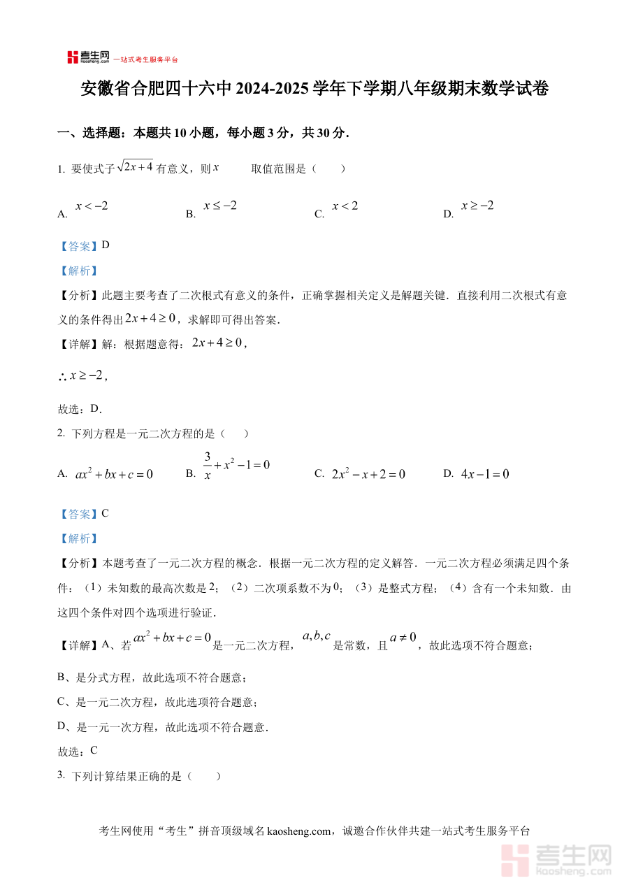 《精品解析:安徽省合肥四十六中2024-2025学年下学期八年级期末数学试卷(解析版)》是针对安徽省合肥市第四十六中学2024至2025学年第二学期八年级学生数学期末测评的专项备考资料,依托该校当期期末数学考试的试卷内容进行深度解析,聚焦本校教学进度与区域教育评价要求,为学生提供与本校考查重点高度匹配的学习支持,帮助使用者快速对接期末测评的核心方向。