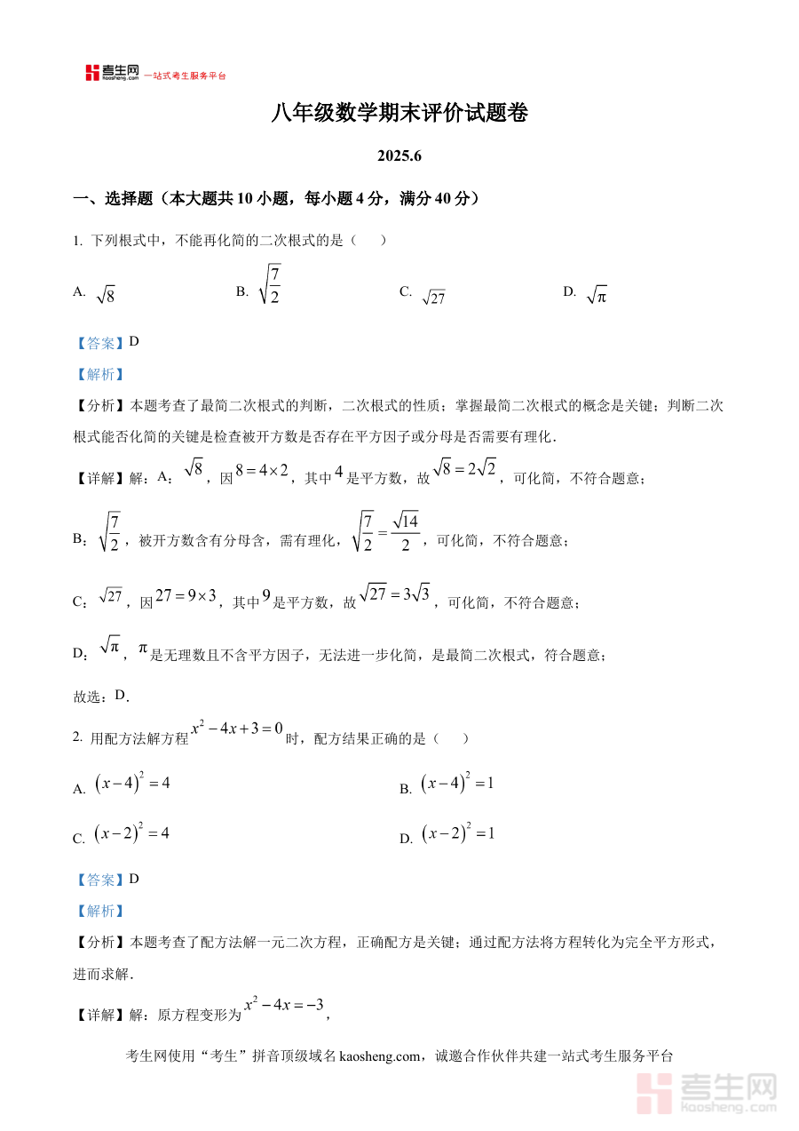 《精品解析:安徽省合肥寿春中学2024-2025学年八年级下学期期末数学试题(解析版)》是针对安徽省合肥市寿春中学2024至2025学年八年级下学期期末数学考试的专项备考资料。该资料依托该校期末数学考试的命题方向与教学实际,为使用者提供了贴合本校学情的复习参考内容。作为解析版资料,它不仅包含完整的试题文本,还对试题进行了系统深入的解读,帮助使用者准确把握考试的考查重点与要求,为后续复习提供清晰指引。
