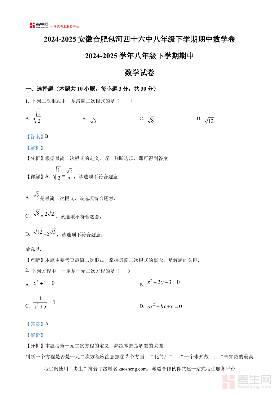《精品解析:安徽省合肥市第四十六中学2024-2025学年八年级下学期期中考试数学卷(解析版)》是针对安徽省合肥市第四十六中学特定学年段与考试节点的数学学科备考资料,其核心定位是服务于该校八年级学生在2024-2025学年下学期期中考试前的复习与准备环节。该资料依托该校当期期中考试的命题方向与考查范围,为学生提供具有针对性的学习支持,帮助学生提前熟悉考试的整体框架与考查重点,为后续的复习规划奠定基础。