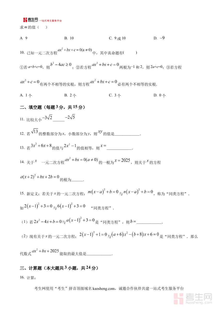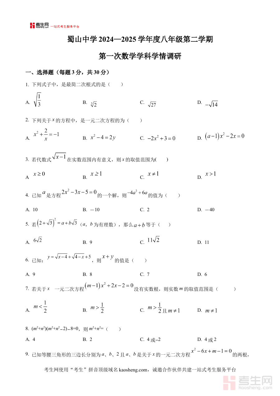 《精品解析:安徽省合肥市蜀山中学2024-2025学年八年级下学期3月月考数学试题(原卷版)》是针对安徽省合肥市蜀山中学特定学年学期与月份的数学学科阶段性考试资料。其年份范围为2024-2025学年,对应八年级下学期3月的月考场景,属于该校数学学科校内阶段性测试的原卷版本。作为贴合本地校考实际的备考资料,它能够为使用者提供与该校月考直接相关的练习与参考载体,帮助使用者快速对接该校该阶段的数学考试要求。