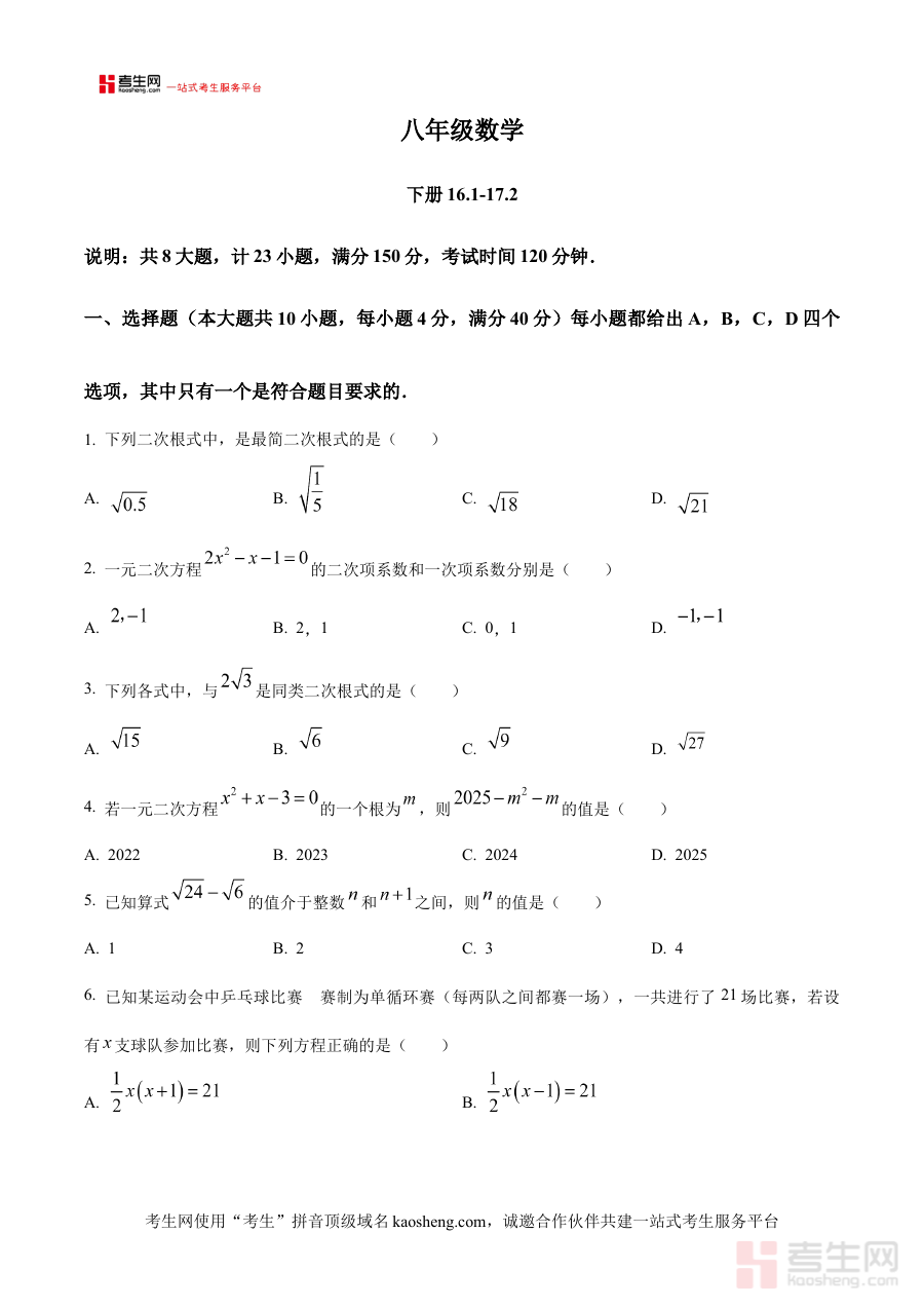 本资料主要适用于安徽省合肥市高新区的八年级学生、数学教师及关注学生数学学习进展的家长群体。作为第一次月考的原卷版资料,它能真实呈现该阶段数学学习的检测标准,帮助学生进行针对性复习与备考准备,提升阶段检测的应对效果,也为教师和家长提供客观的评估依据,促进教学与学习的精准对接和有效提升,助力实现阶段性学习目标的达成。
