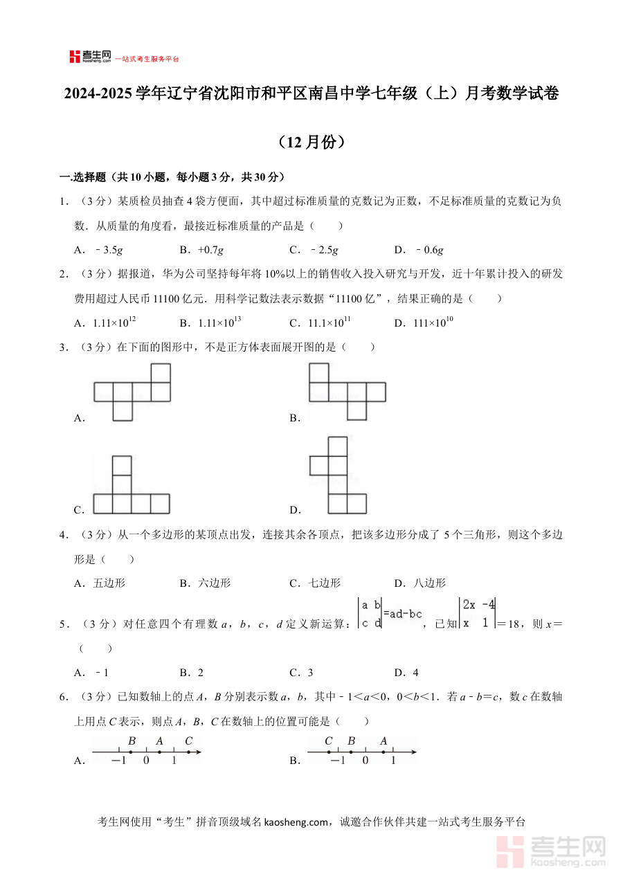 《辽宁省沈阳市和平区南昌中学2024-2025学年七年级上学期月考数学试卷(12月份)》是针对特定区域与学段的标准化数学考试资料,聚焦2024至2025学年辽宁省沈阳市和平区南昌中学七年级上学期12月份的月考场景,精准贴合该阶段学校数学教学进度与校考要求,为学生提供与实际考试高度匹配的练习资源,是该阶段数学备考的重要辅助材料。