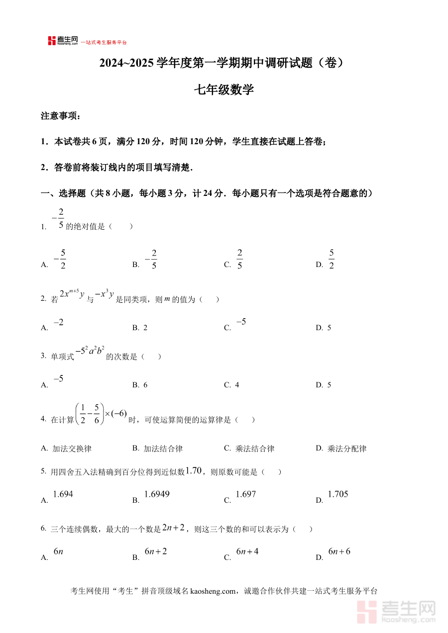 《精品解析:陕西省西安市临潼区部分学校2024-2025学年七年级上学期期中考试数学试卷(原卷版)》是聚焦陕西省西安市临潼区部分学校2024至2025学年七年级上学期数学学科期中检测的专业备考资料,严格对应该地区该学段的教学进度与考试要求,为使用者提供与实际考试完全一致的原卷呈现形式,是连接日常教学与期中检测的重要桥梁,能够让使用者快速了解本次考试的整体框架与命题方向。