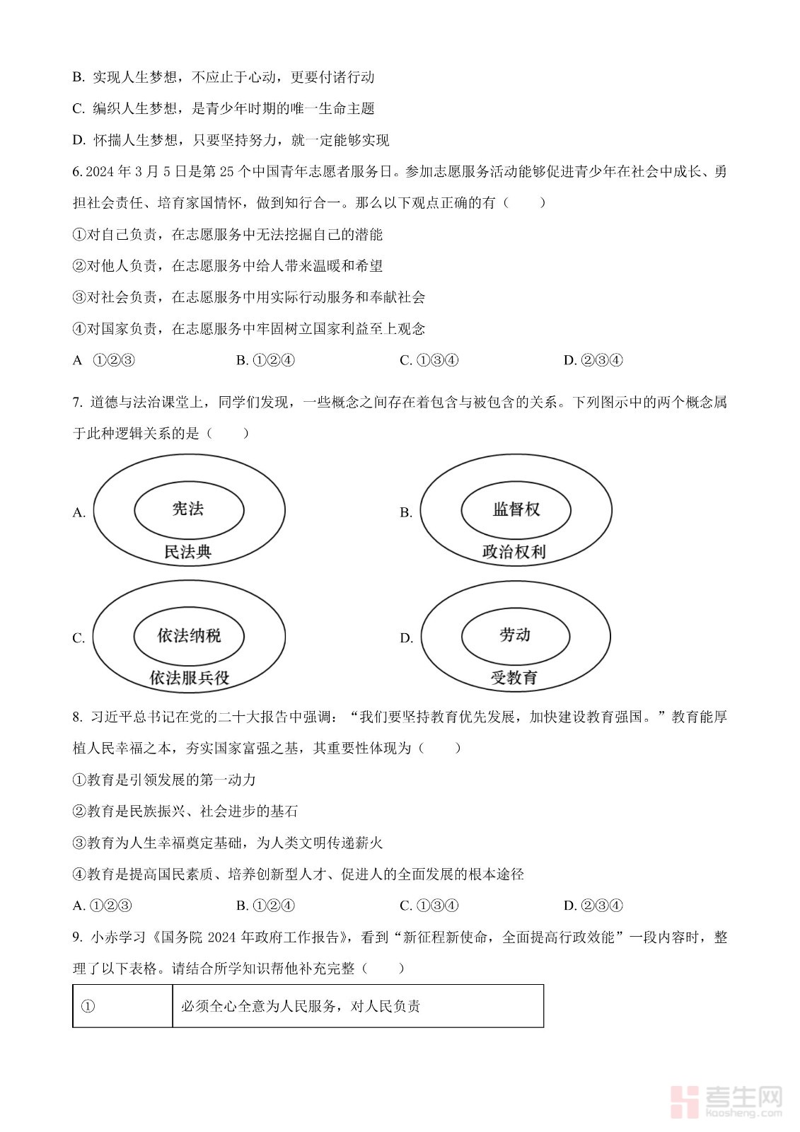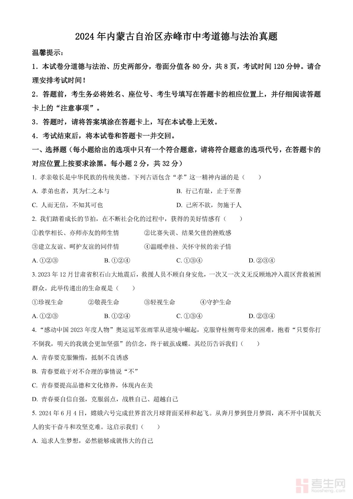 2024年内蒙古自治区赤峰市中考道德与法治真题(原卷版)