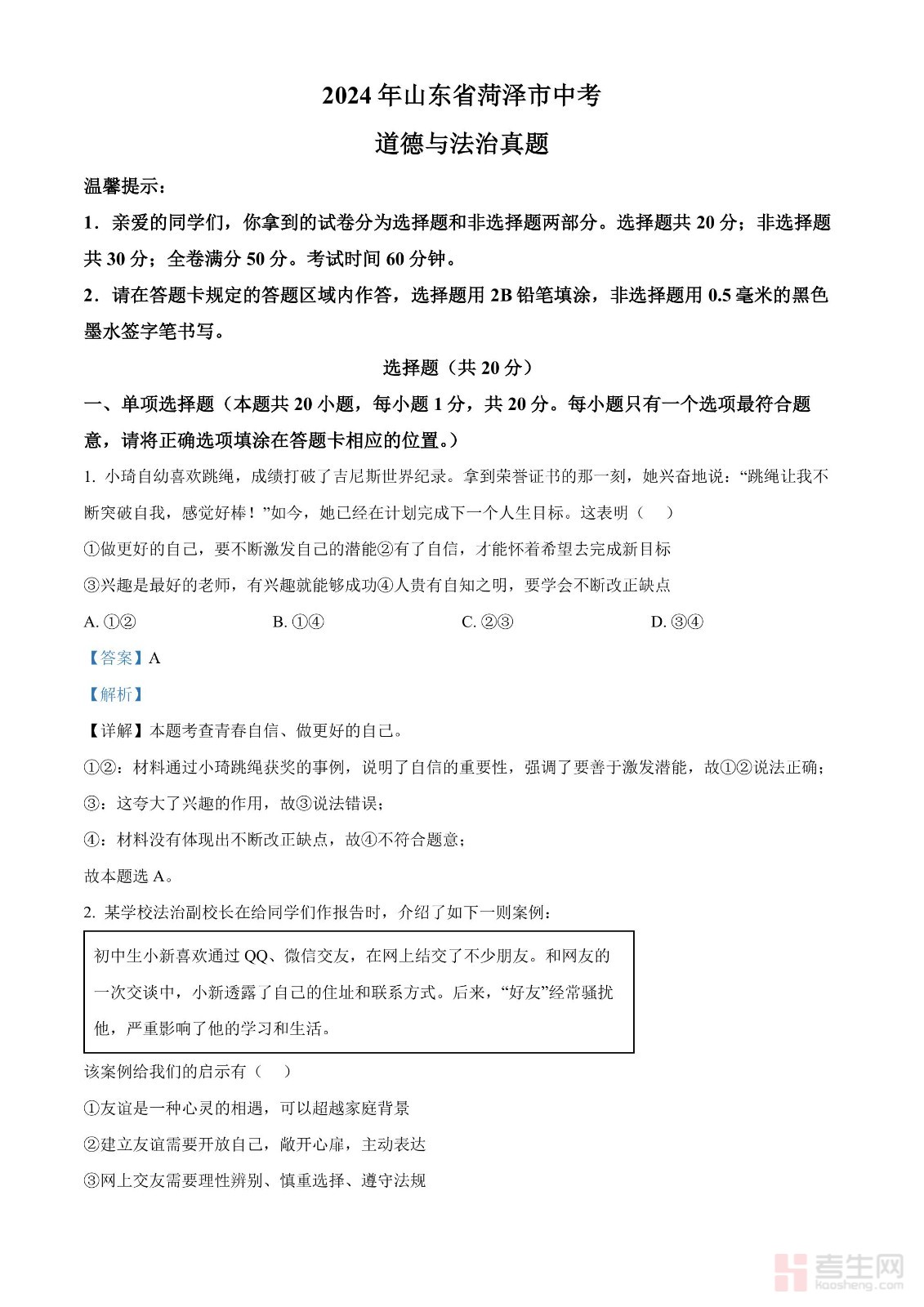 2024年山东省菏泽市中考道德与法治真题(解析版)