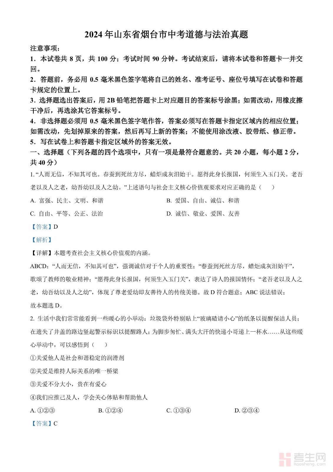 2024年山东省烟台市中考道德与法治真题(解析版)