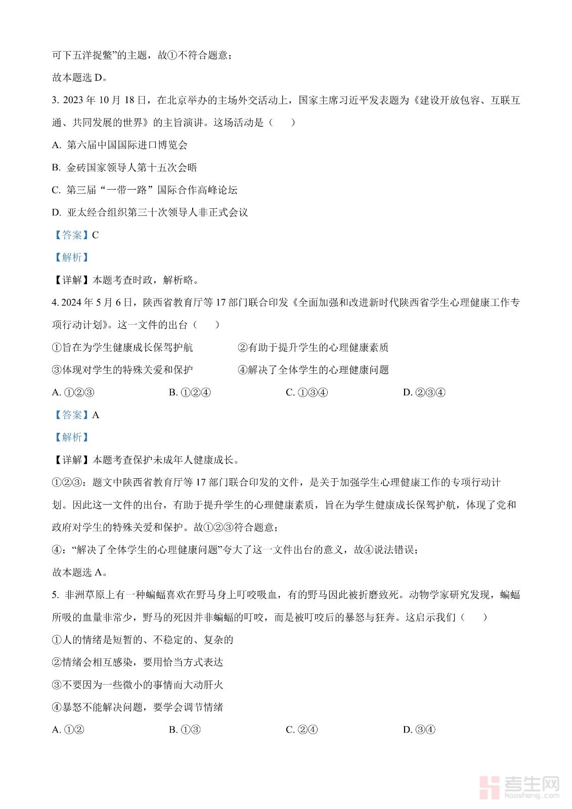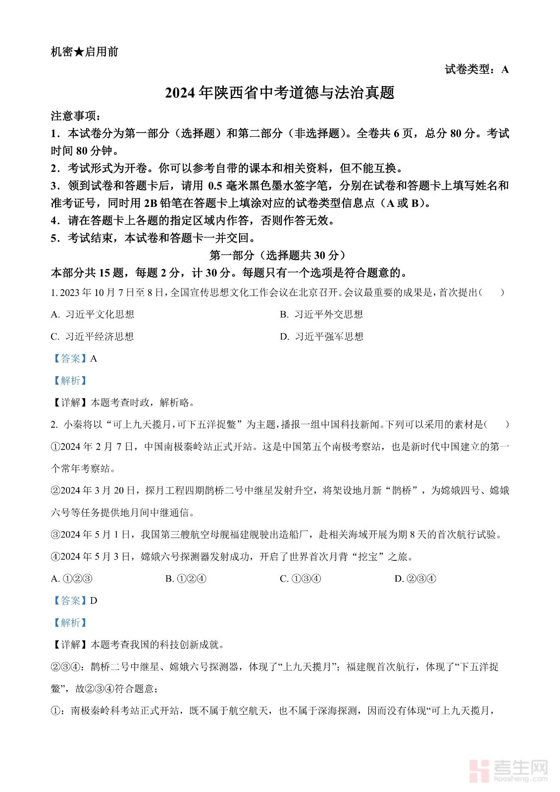 2024年陕西省中考道德与法治真题(A卷)(解析版)