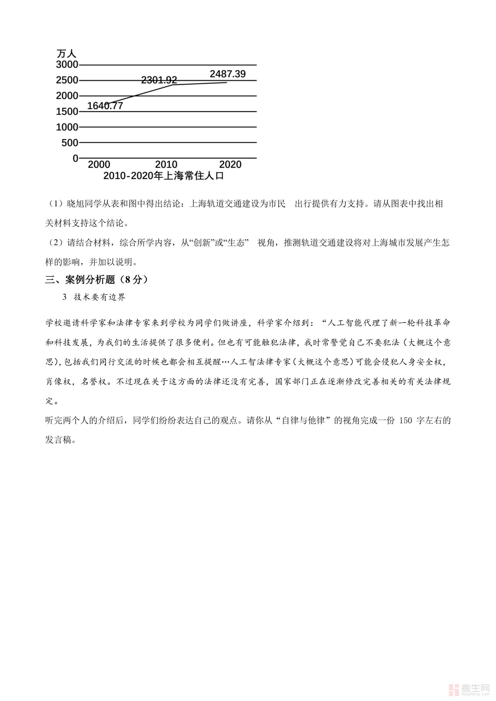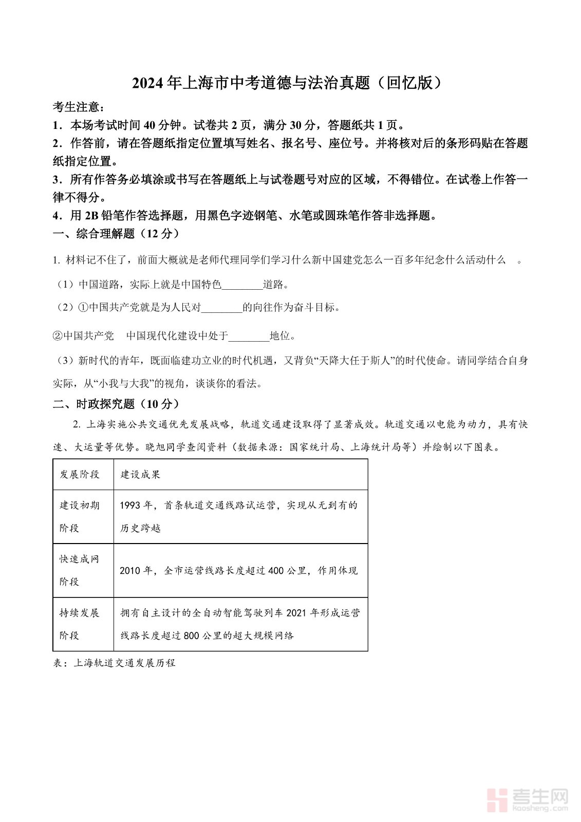 2024年上海市中考道德与法治真题(回忆版)(原卷版)