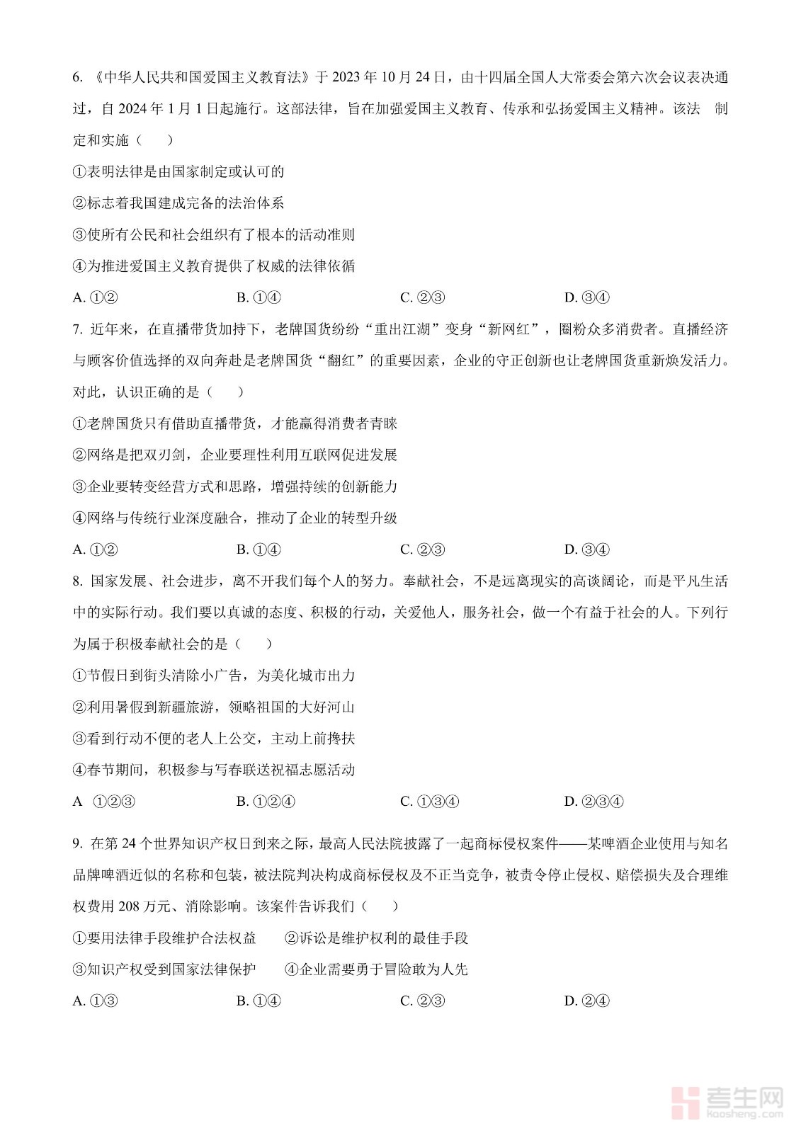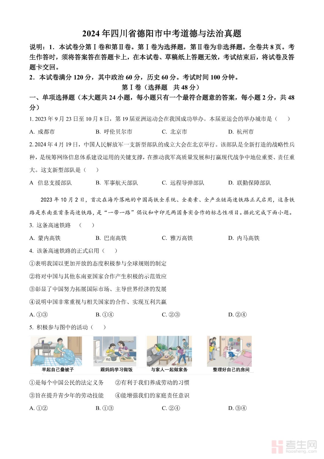 2024年四川省德阳市中考道德与法治真题(原卷版)